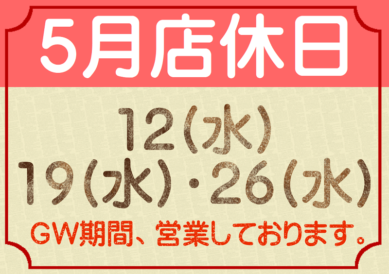 5月店休日のお知らせ ポスト 2021年4月27日 ■■■5月店休日のお知らせ■■■ GWは営業しております^^ 5月12日(水)・5月19日(水)・5月26日(水) は店休日とさせていただきます。 営業時間:10時~18時30分 ※作業受付時間は18時までとなります 担当:なかずみ