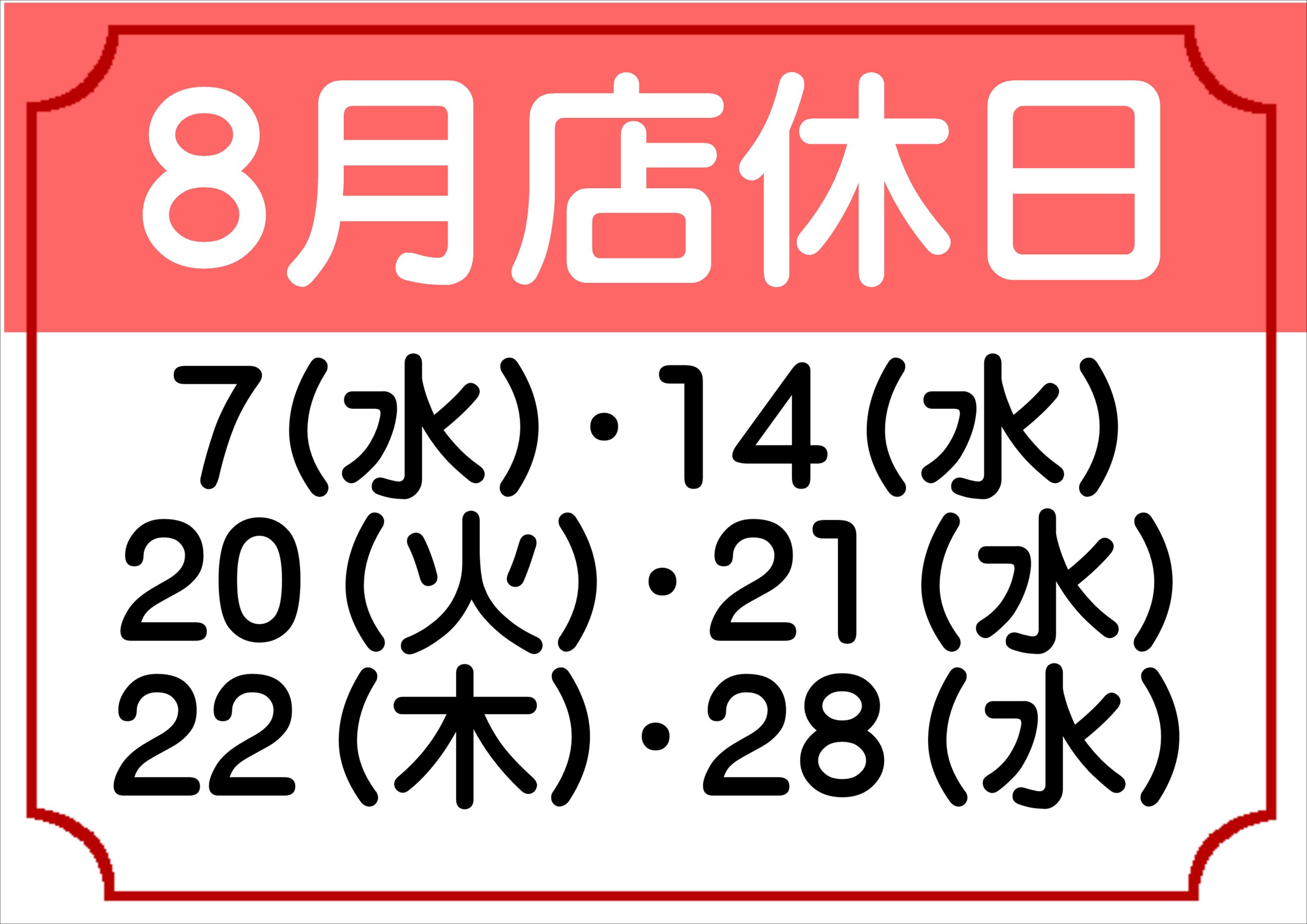 ☆8月店休日のお知らせ☆ ポスト 2024年7月31日 ■■8月店休日のお知らせ■■■ 8月7日(水)・8月14日(水) 8月20日(火)・8月21日(水)・8月22日(木) 8月28日(水) は店休日とさせていただきます。 タイヤ館 長崎 住所:851-2107長崎県西彼杵郡時津町久留里郷1439-32 電話番号: 095-860-2145 相談予約 タイヤ点検・安全点検/タイヤ履き替え/オイル交換/その他ピット作業の予約