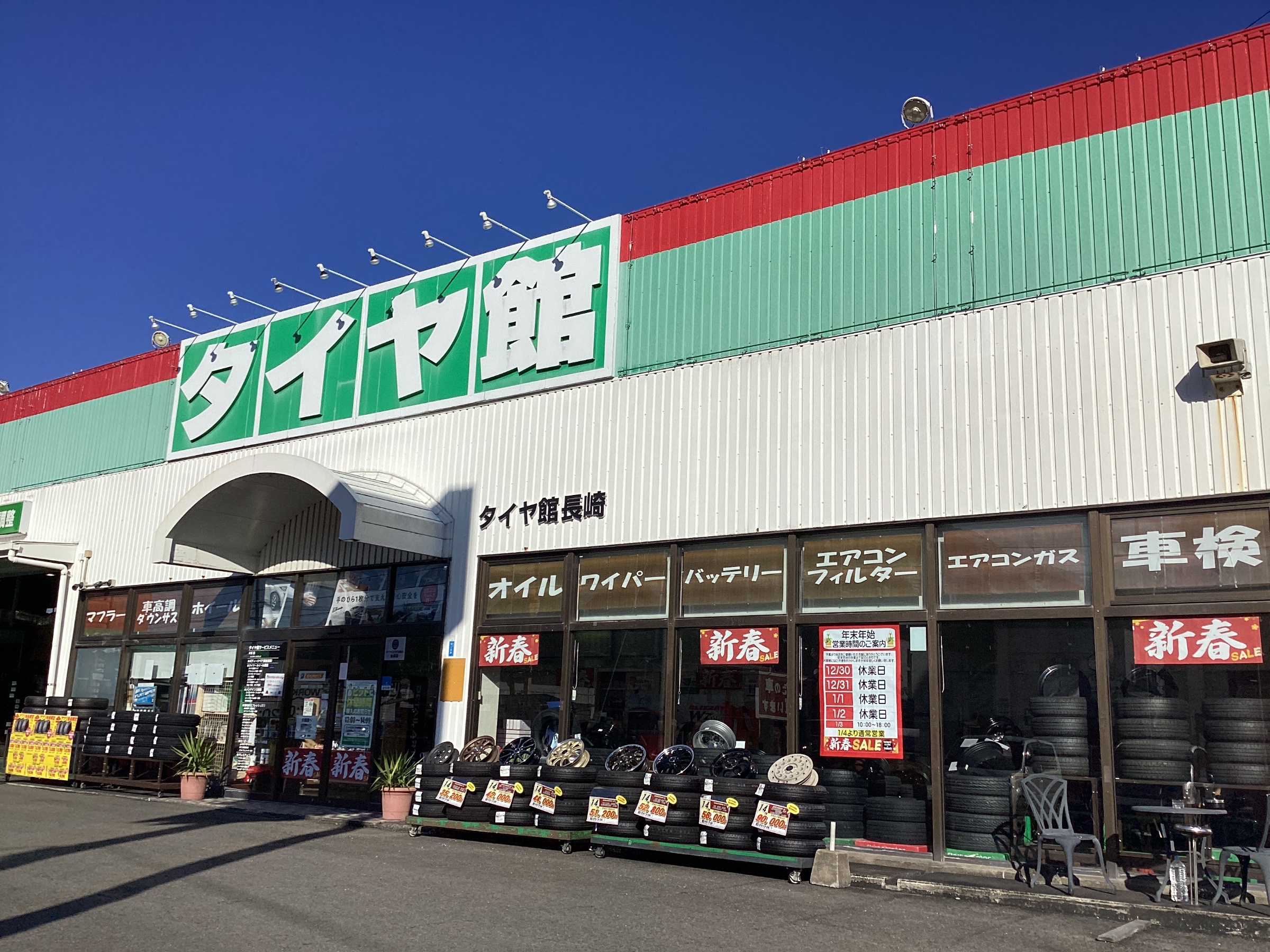 ご挨拶 ポスト 2025年12月29日 今年もタイヤ館長崎をご愛顧頂き誠にありがとうございました。 2025年の営業は12月29日(月)まで営業となります。 ※12月30日(火)・ 12月31日(水)・1月1日(木)・1月2日(金) 年末年始はお休みさせていただきます。 年明け、2026年【新春初売り】開催いたします 3日(土) 10時00分~オープン 2026年もタイヤ館長崎を宜しくお願いいたします タイヤ館 長崎 住所:851-2107長崎県西彼杵郡時津町久留里郷1439-32 電話番号: 095-860-2145