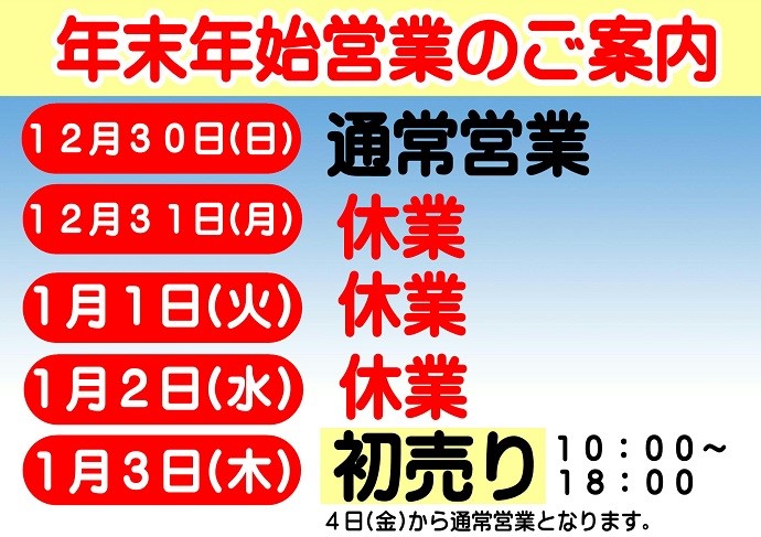 年末年始 ポスト 2018年12月26日 今年もあと残りわずかとなりました。 タイヤ館長崎 2018年の営業は12月30日(日)まで通常営業しております。 12月31日(月)・1月1日(火)・1月2日(水)は 休業させていただきます。 2019年は 初売りでスタートいたします! 3日(木)10時よりオープン 18時まで 4日(金)10時よりオープン 19時まで【受付終了18:30】 となります。 宜しくお願いいたします。 担当:なかずみ