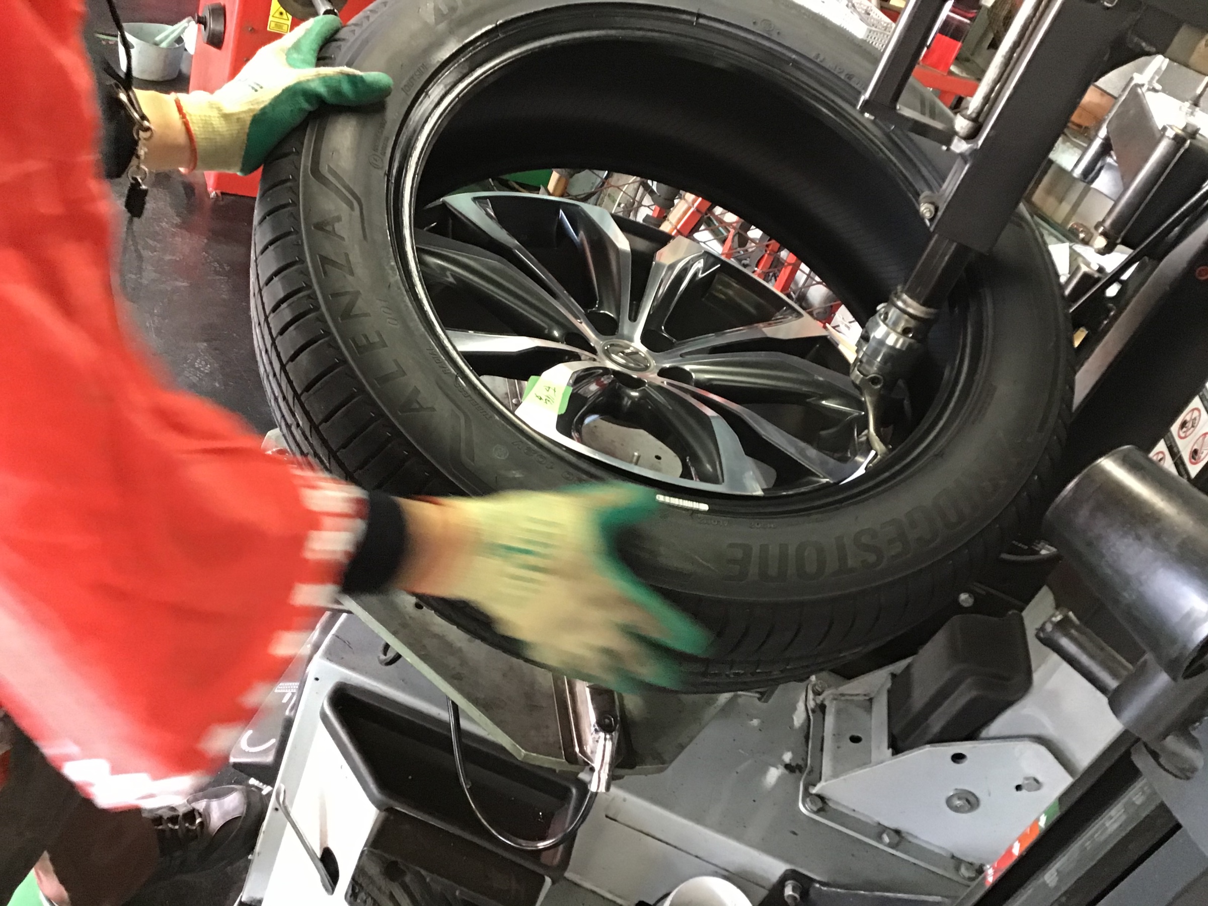 チェンジャーでタイヤ組替中のタイヤ館男子を手元から
