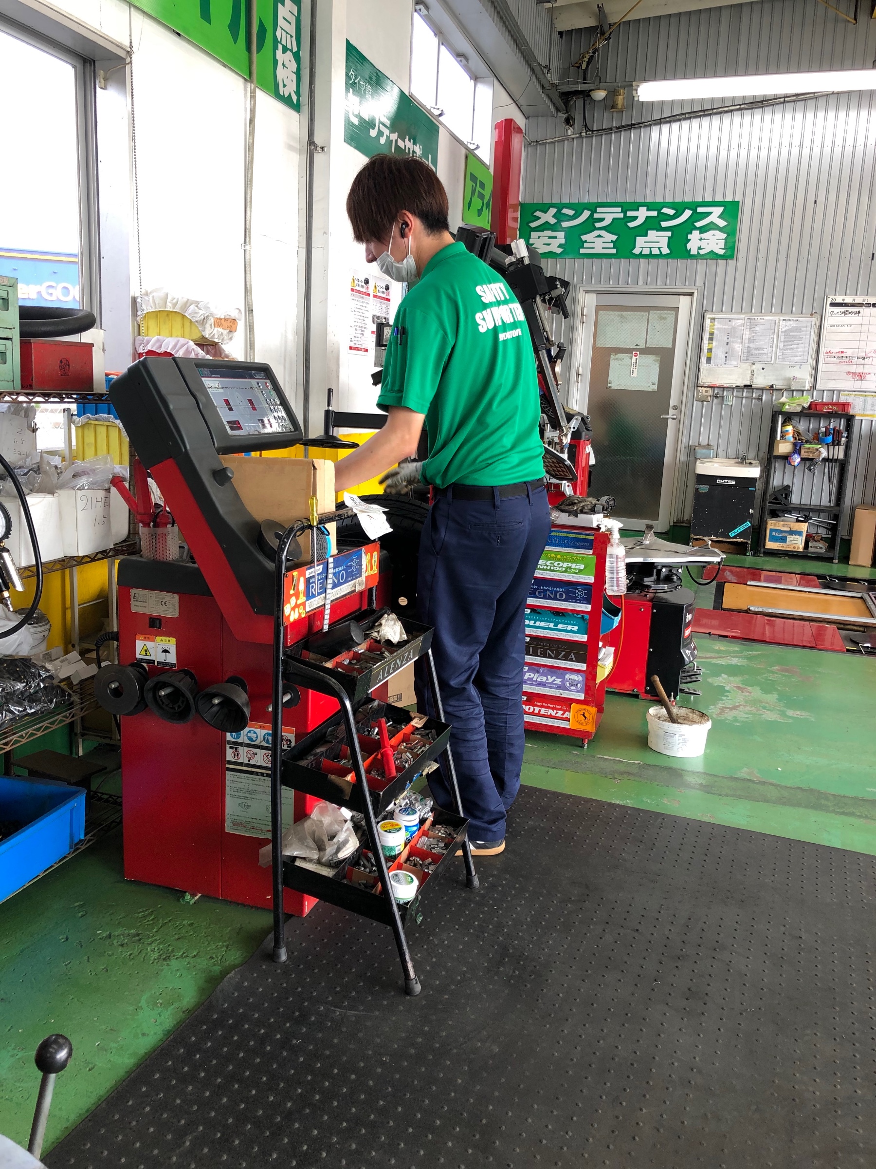タイヤはネクストリーになります。「ウェット性能」「ドライ性能」「乗り心地」といった基本性能も確保。セダンから軽・コンパクトカーまで豊富なサイズラインアップを揃え、幅広い車種に対応する「ネクストリー」。これがブリヂストンの低燃費ベーシックタイヤになります。冨田さんが丁寧に専用工具を使いセンターフィットで取り付けします!横須賀スタッフがバランスの調整を担当しました!