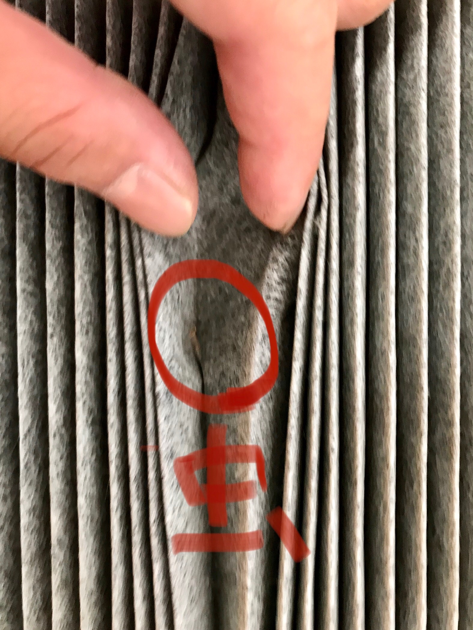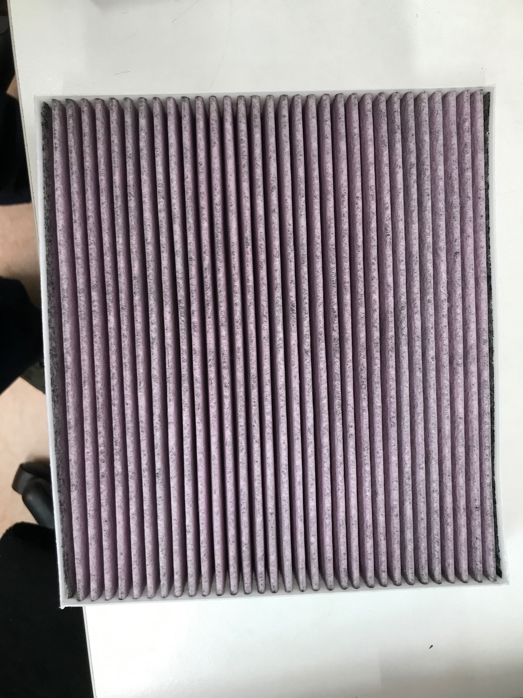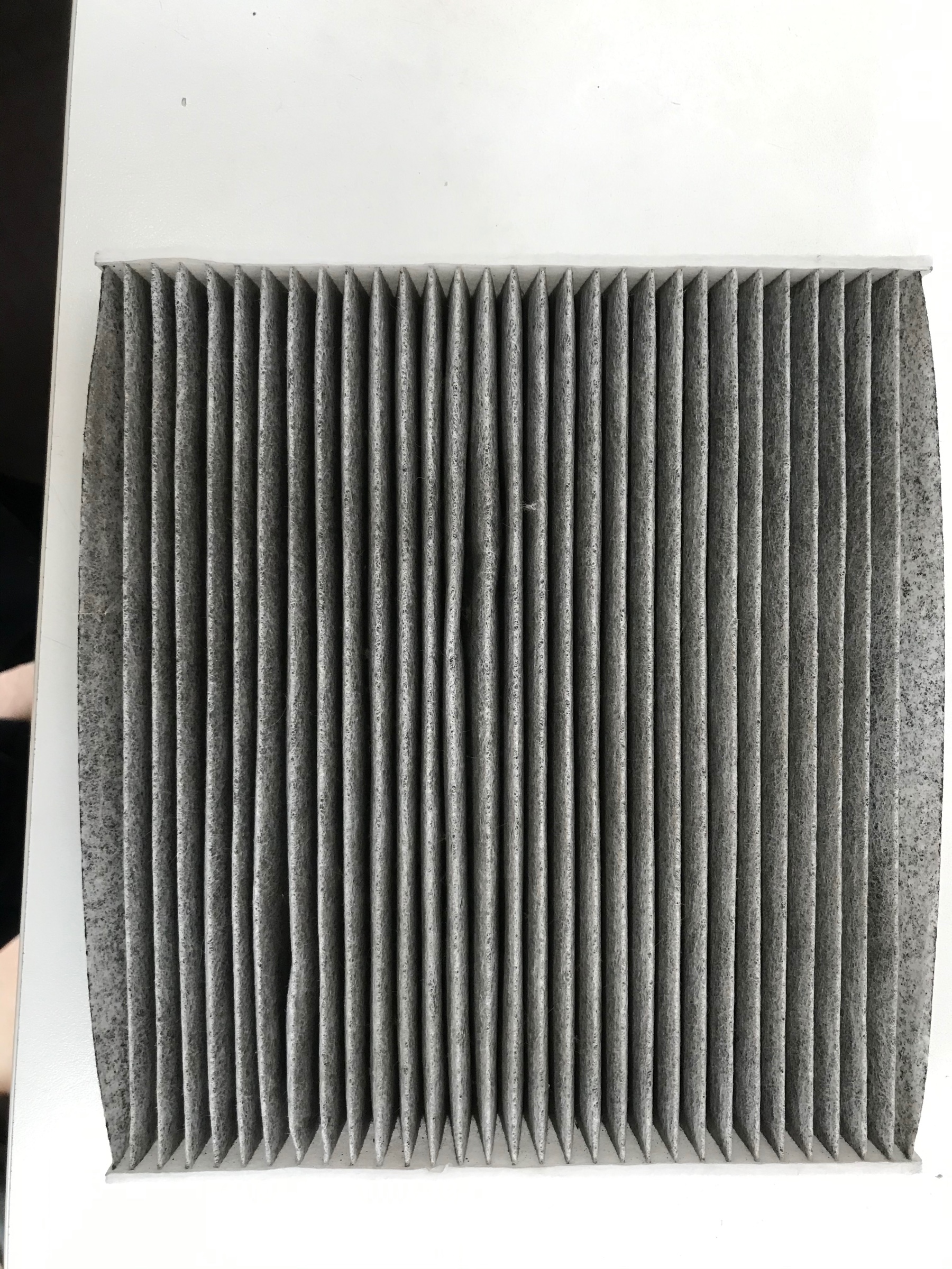 フィルターの付いている場所は少し室内をバラさないと見えない所についています。こんな感じのが入っています。ちなみにこれは那珂ん太の車から外した物になります。かなり汚れていますね。1年以上交換していませんでした。。。