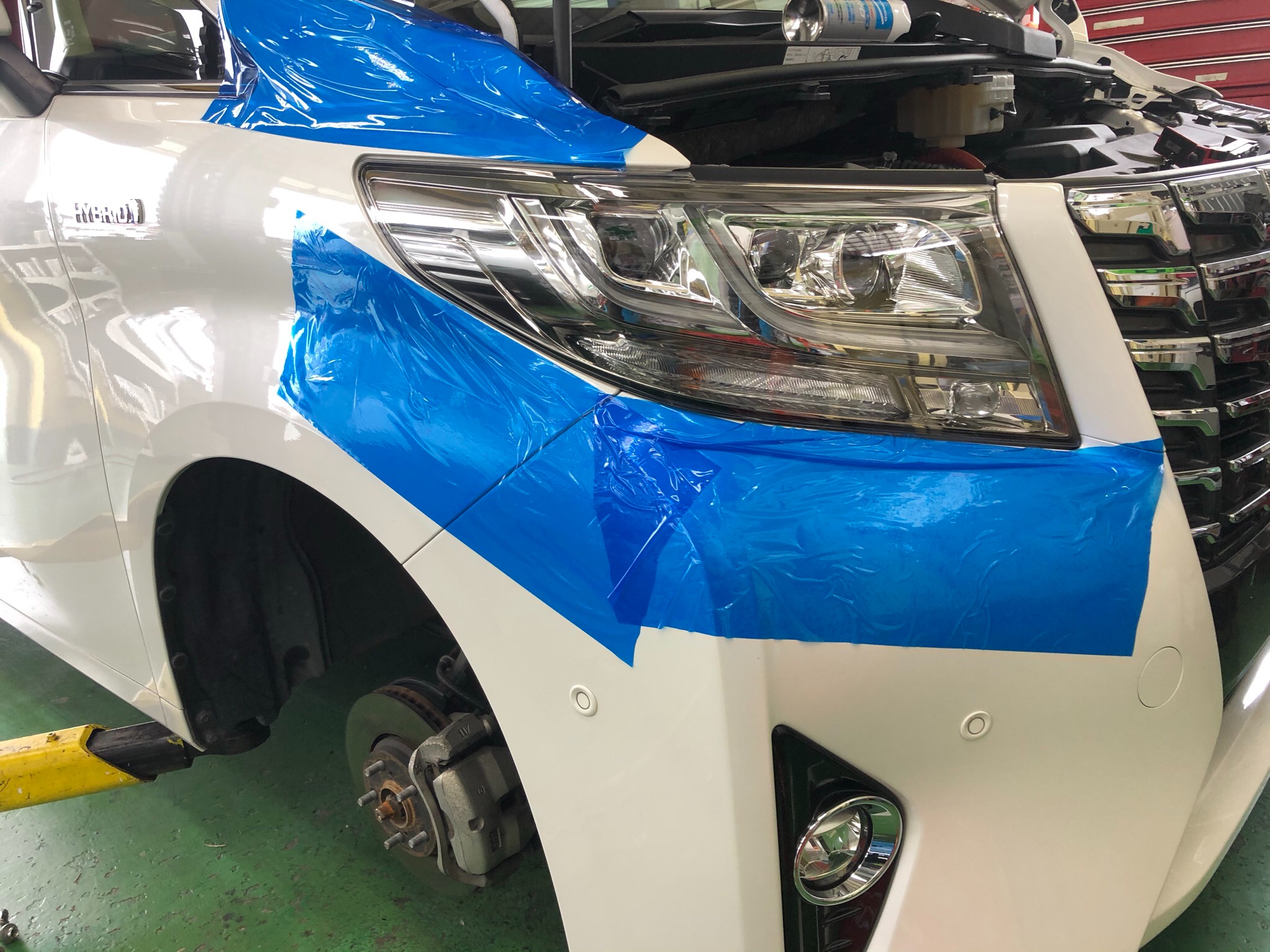 フロントは傷が付かないように保護テープを貼って作業を進めさせていただきました。