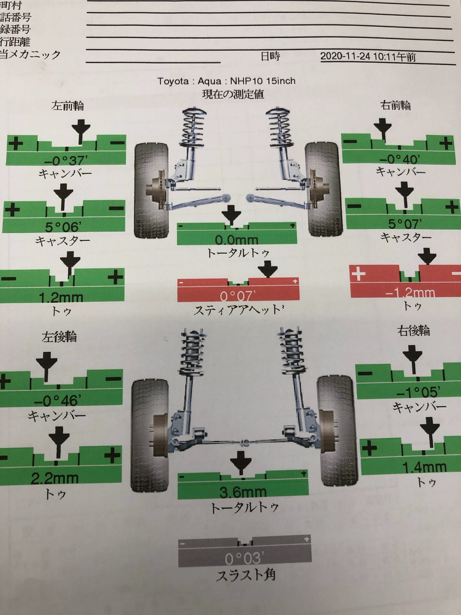 前回車検と一緒にアライメントをやって頂きまして今回も車検でお預かりして車検終了後にまたアライメントをやらせて頂きました。右フロントのタイヤの減りが早かったため測定してみました。