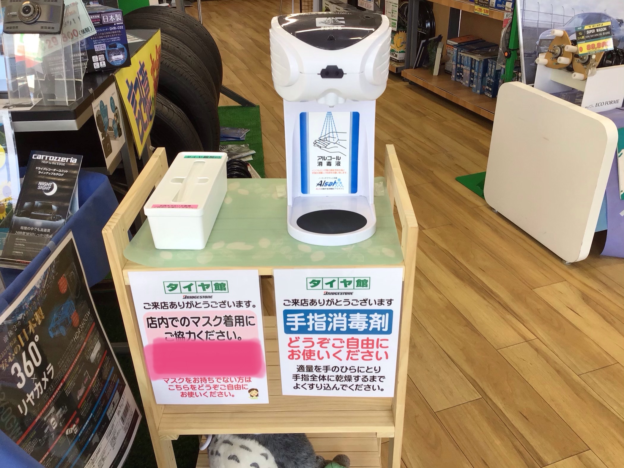 ご来店の際はアルコール消毒とマスクを忘れてしまった際は配布しておりますので