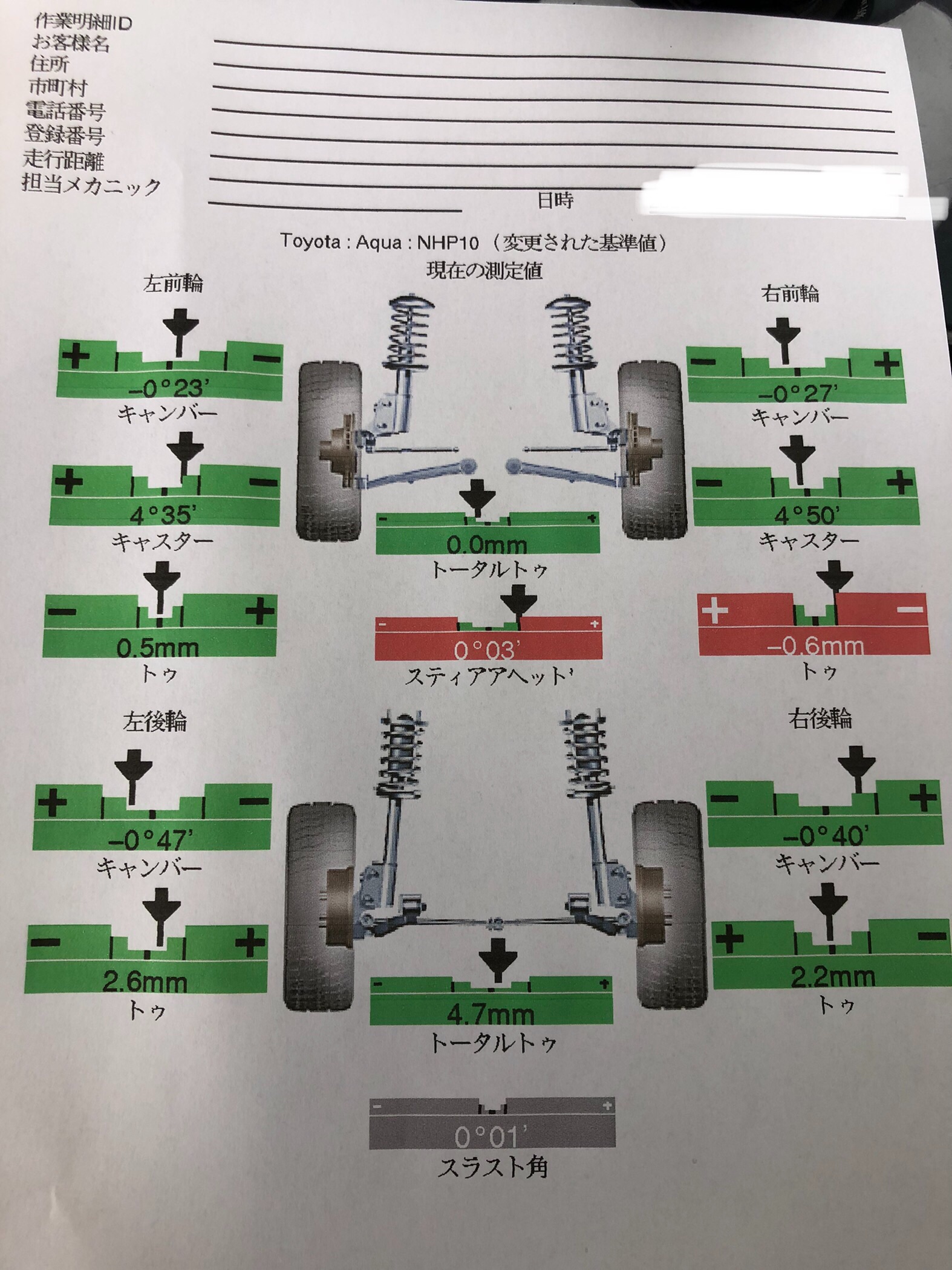 アクアのアライメントを取らせて頂きました。