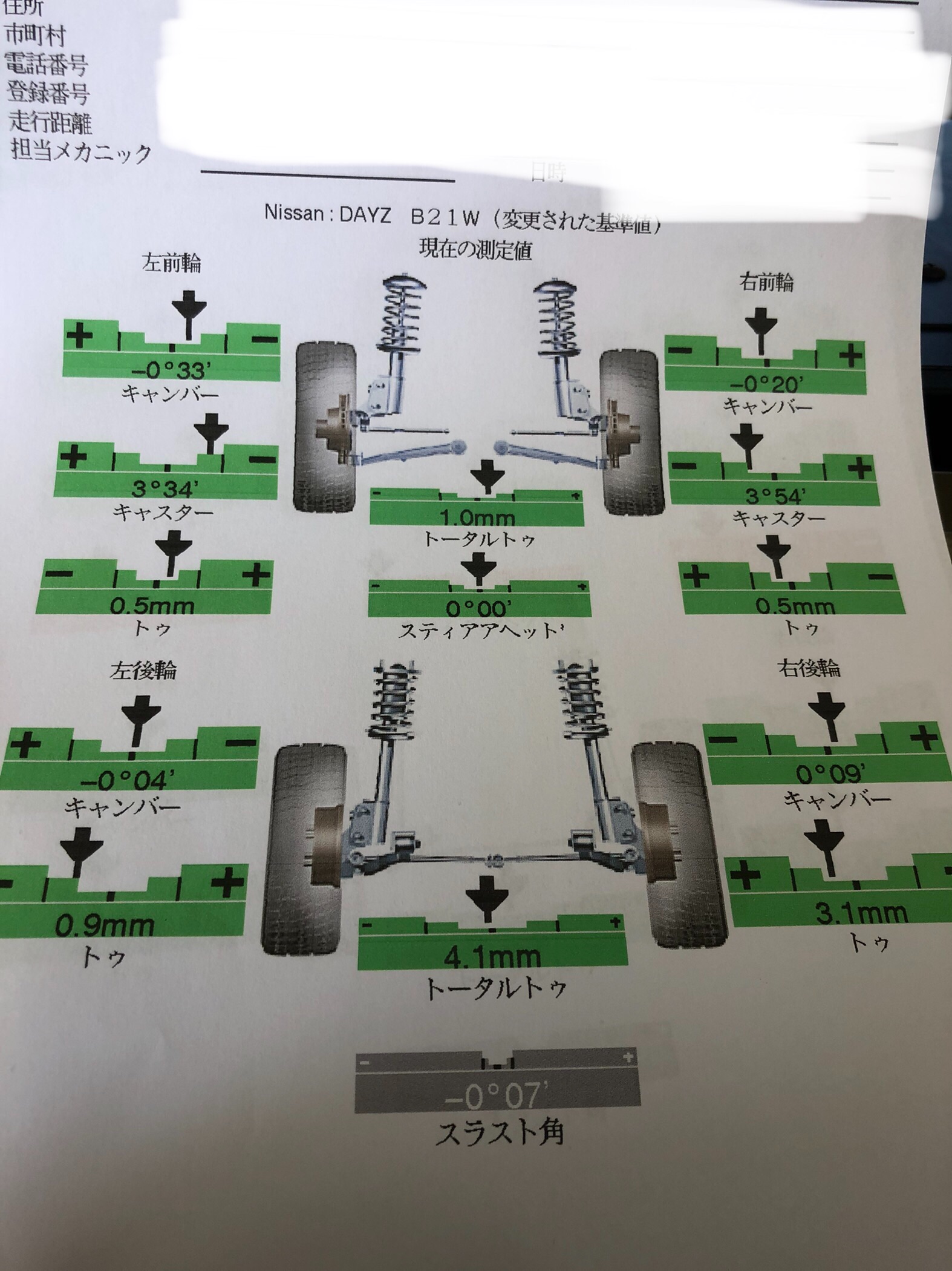 部品等を交換してハンドルがズレたとのことでアライメントを取らせて頂きました。