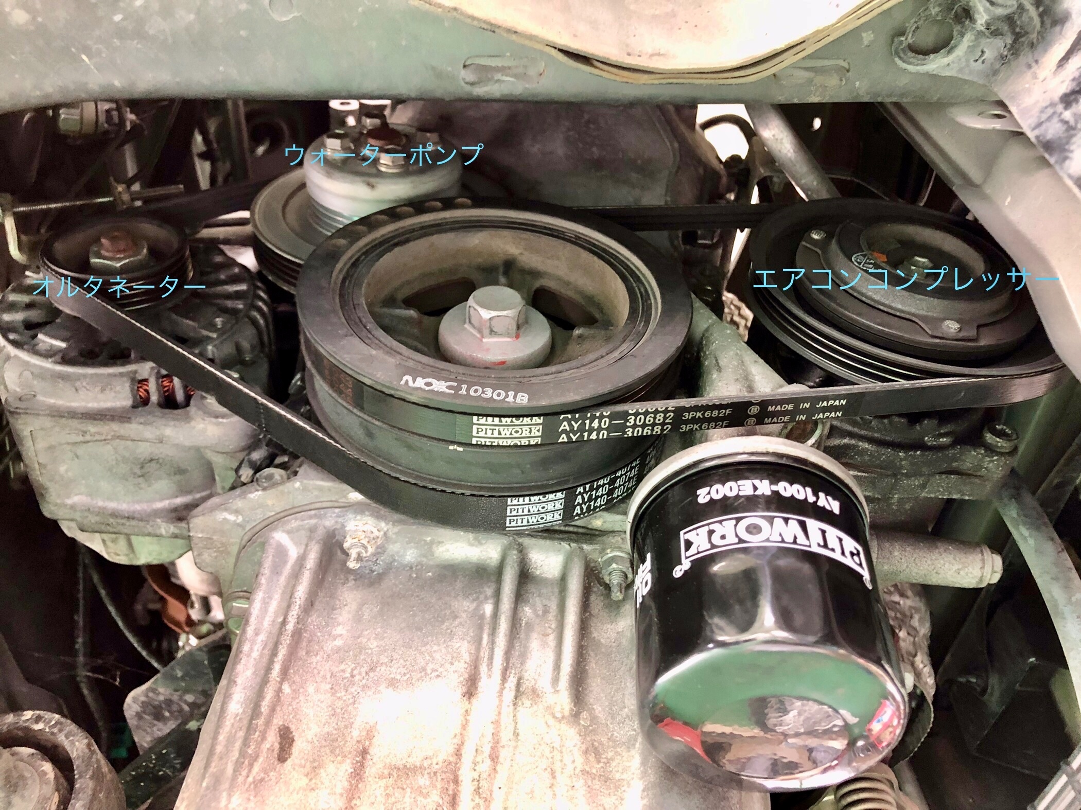 エンジンの回転を利用して、発電機を動かしたり、冷却水を循環させたり、エアコンのコンプレッサを動かしたりする大事な部品です!
