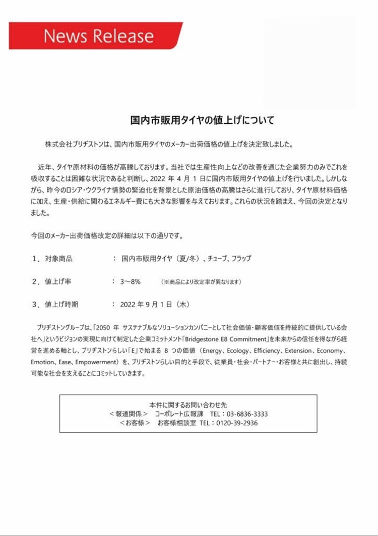 タイヤ原材料の高騰の為9時から値上げが。。。