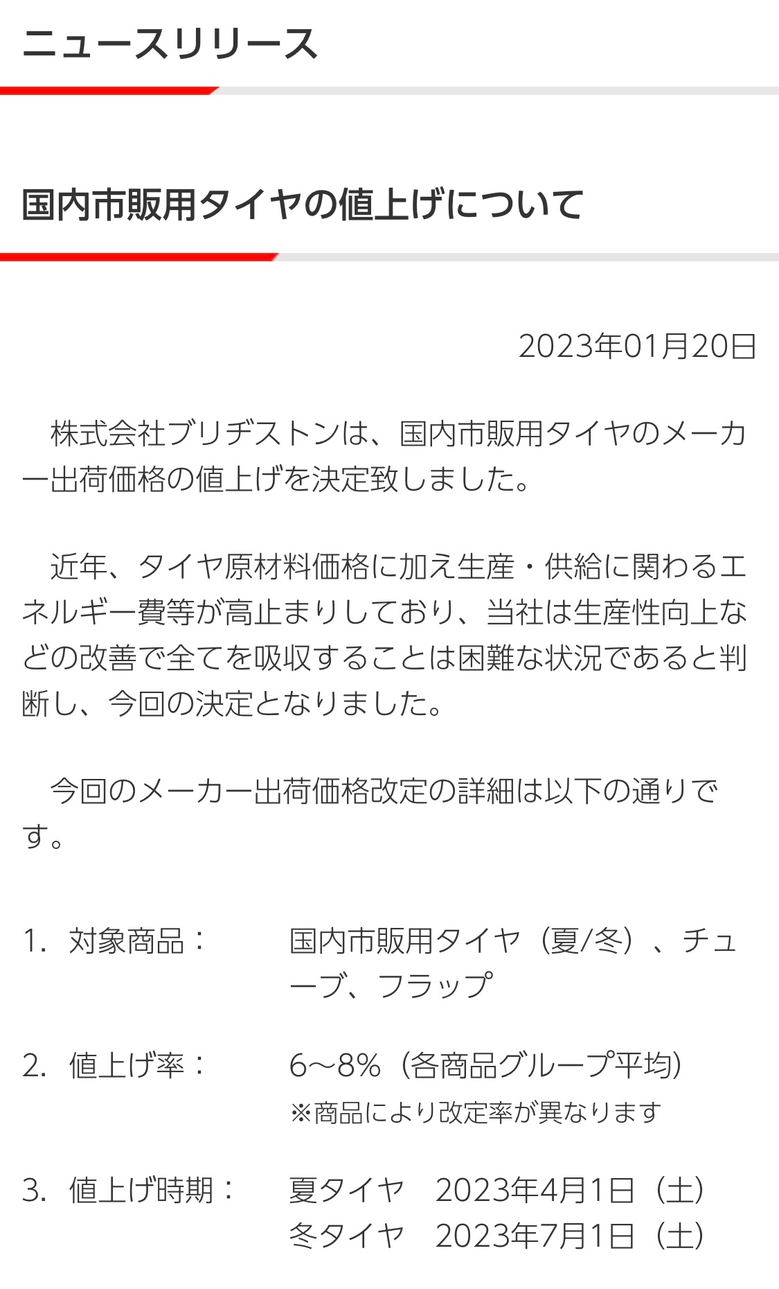 タイヤ値上げ発表