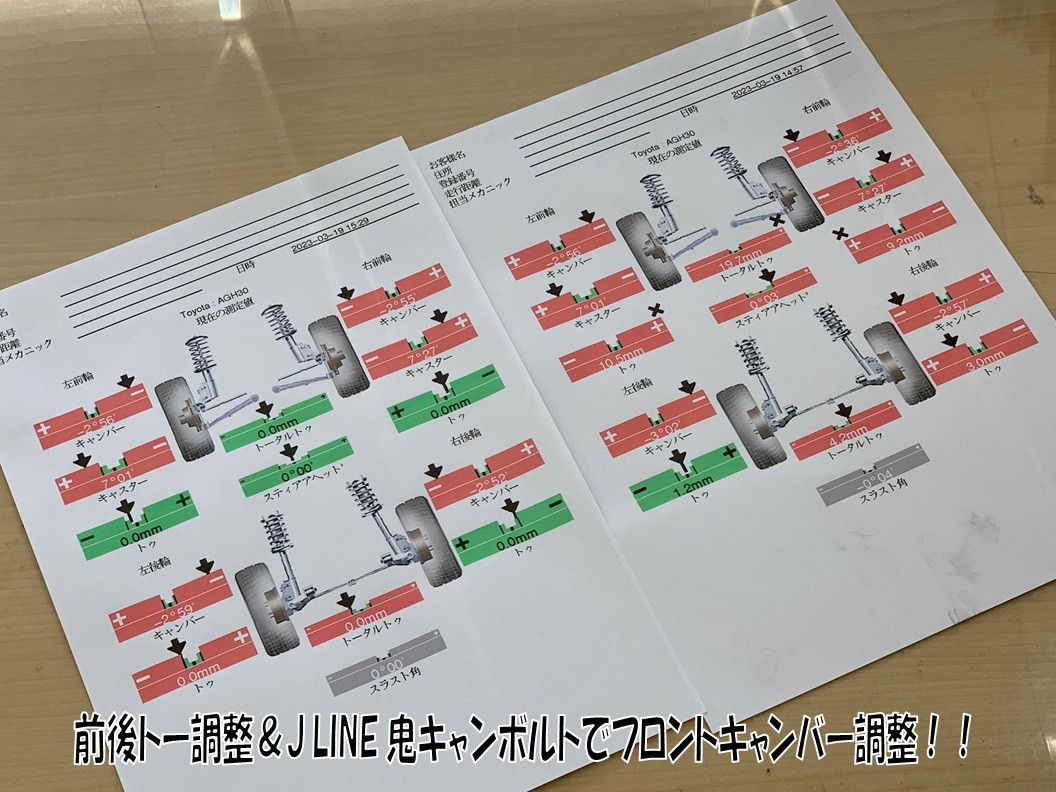 フロントキャンバーをリアと同じくらいに合わせて欲しいとのご依頼を受けていましたので、鬼キャンボルトでリアと大体合うように調整しました♪