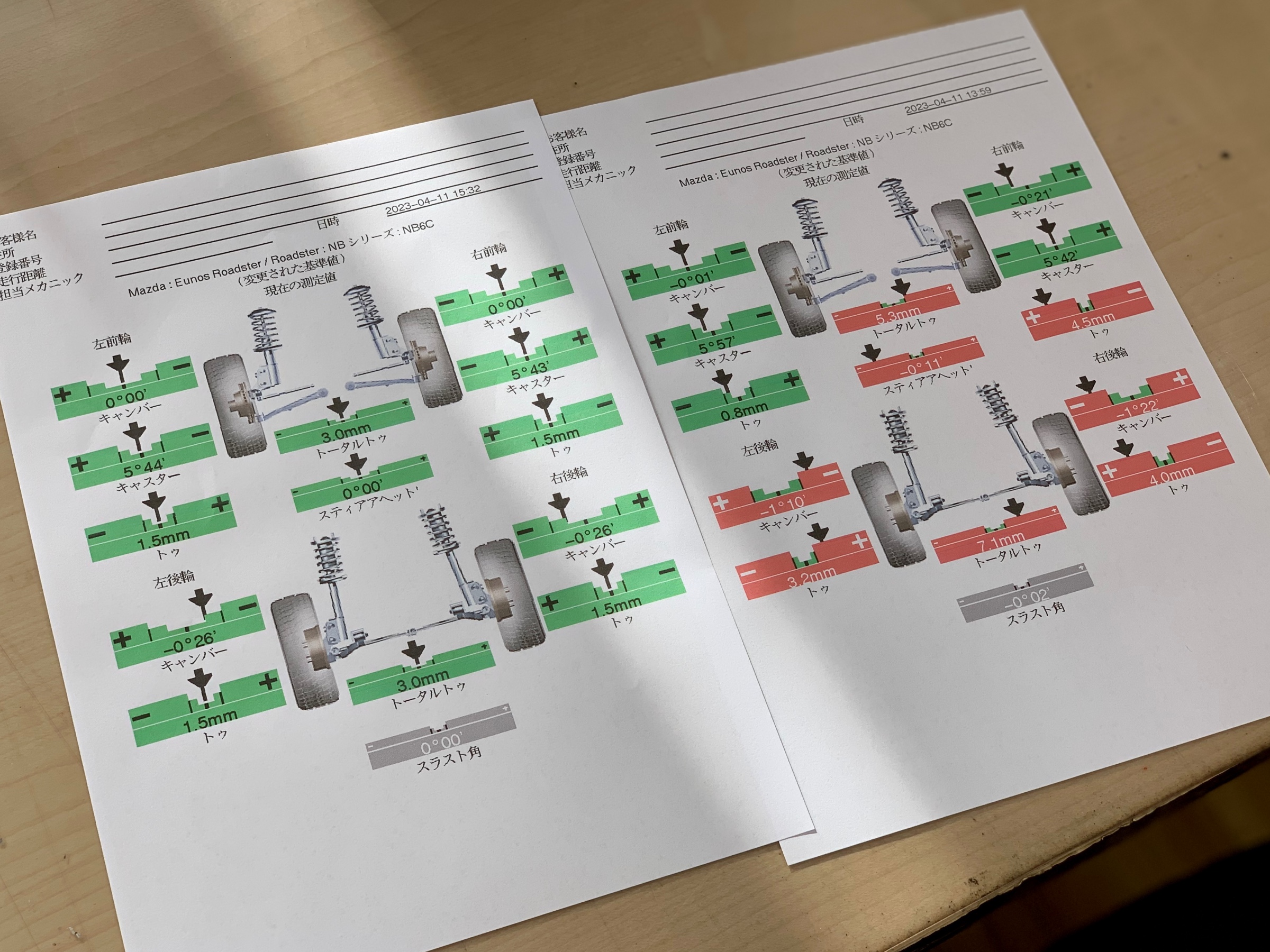 トーとキャスターのアームが一緒で調整が大変なお車でした。。。が、最近のお車では10箇所調整などないので久々に楽しい作業でした♪