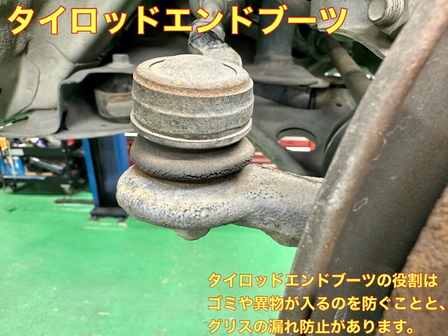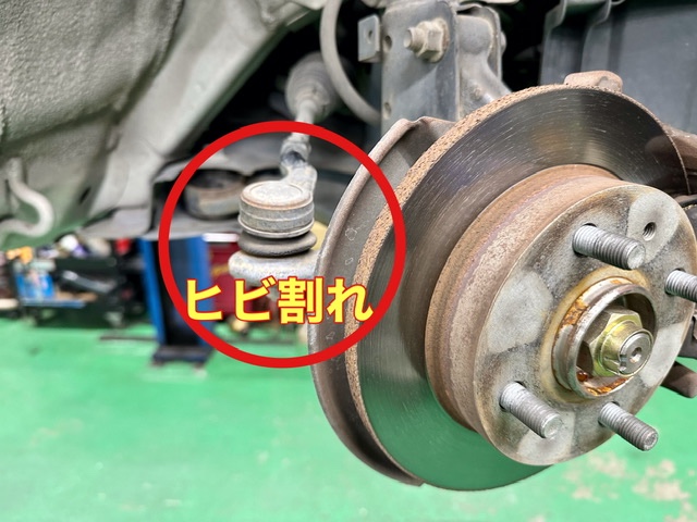 このブーツが経年劣化でひび割れをすると、異物が中に入りボールジョイントを痛め、最悪はジョイント部が外れハンドル操作ができなくなります。