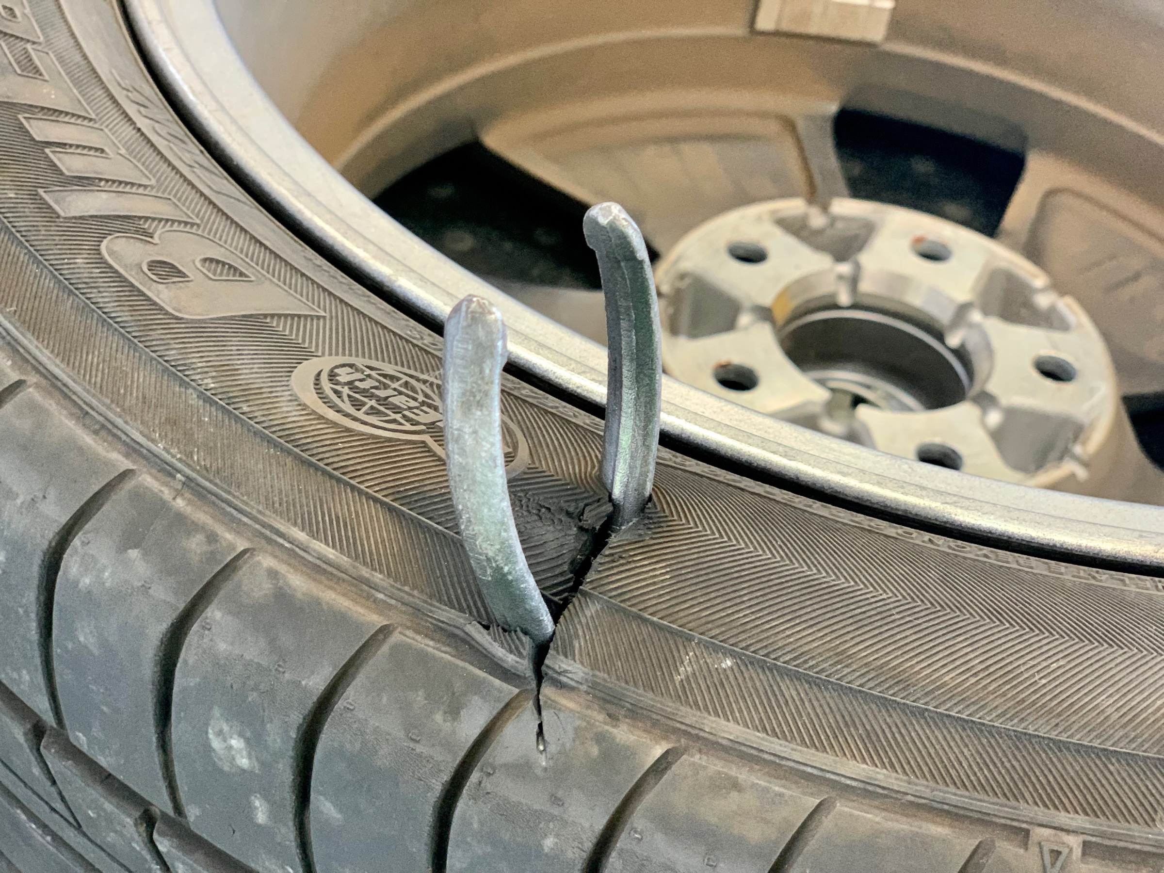 なんとラジオペンチが刺さってパンクしていました!!