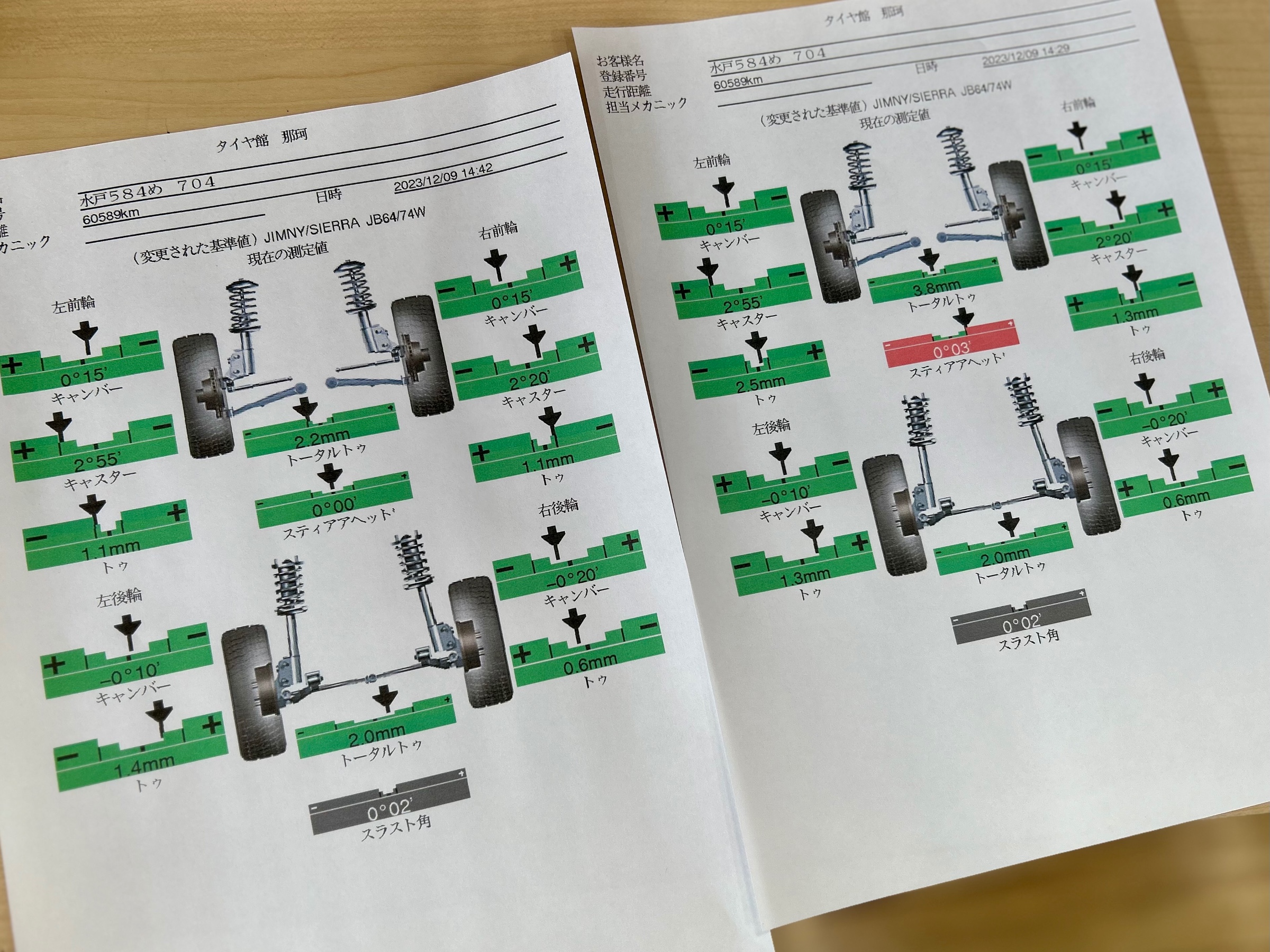 調整箇所はフロントのトーのみになりますが調整ロッドが左右繋がっている為左右良いところで合わせるしかないのですが、なんとかいい感じに合わせられましてお客様もご納得してくださいました。