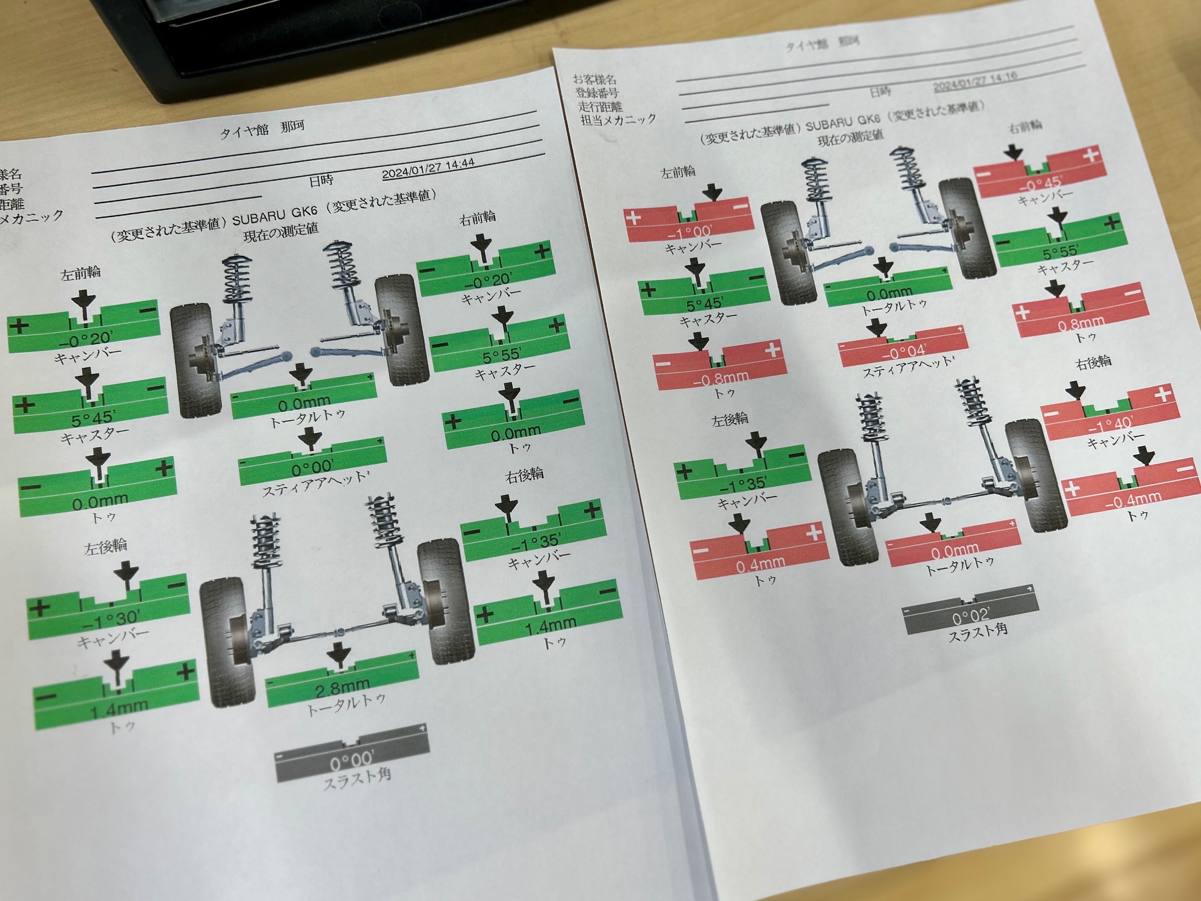 調整箇所はフロント・リアのトー、フロントキャンバーの6箇所調整で見事に基準値に全回復♪