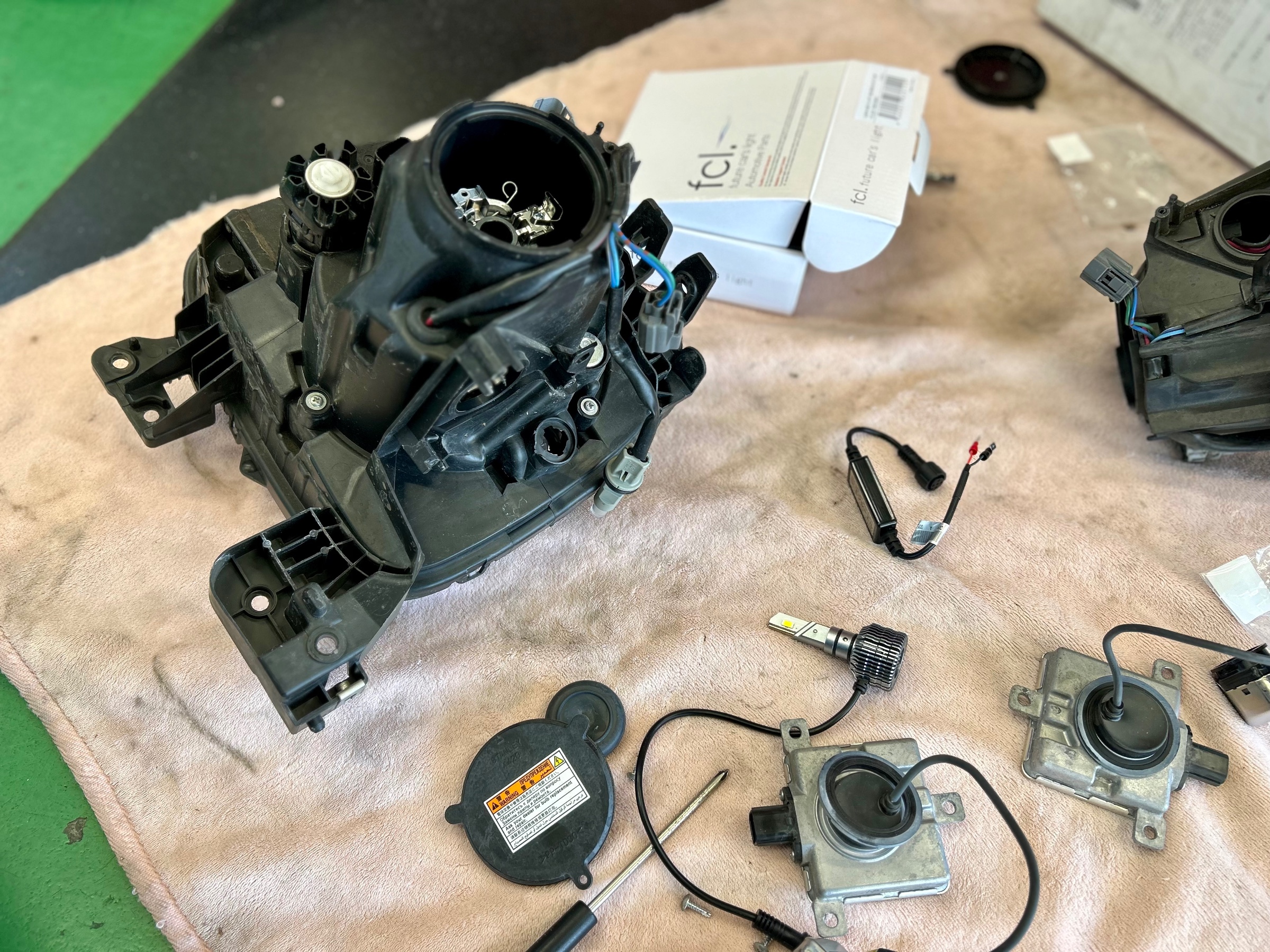 ここからが本題で元々の純正HIDを外しfcl.(エフシーエル)LEDに交換をしていきます♪