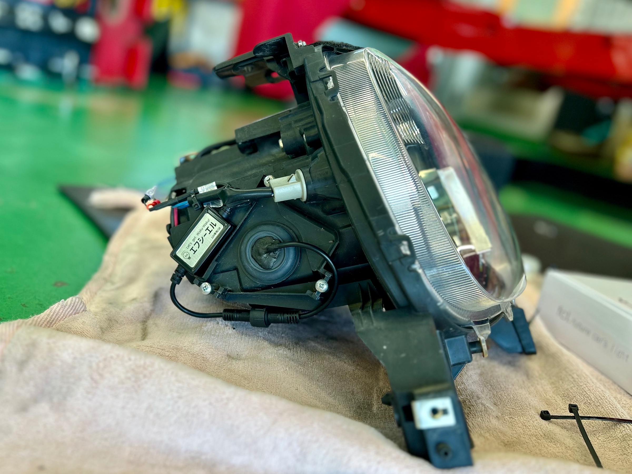 ヘッドライトを外さなくてはいけませんので慎重に行いましたが、以前にもアルトワークスは作業をしていましたので手順は何とか問題なく行えました!