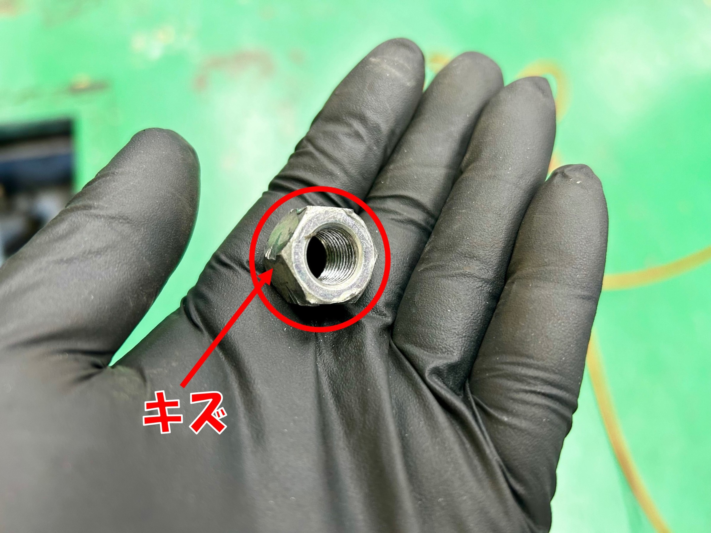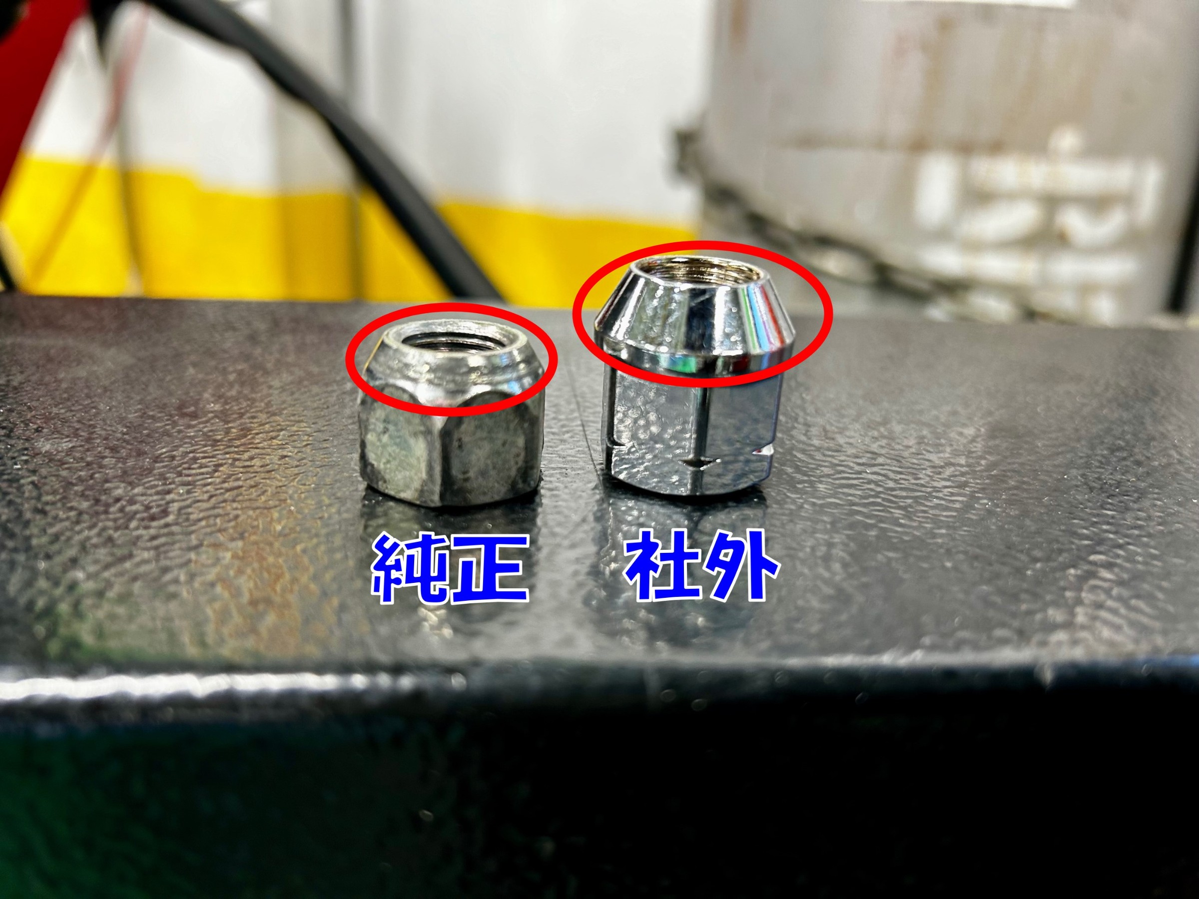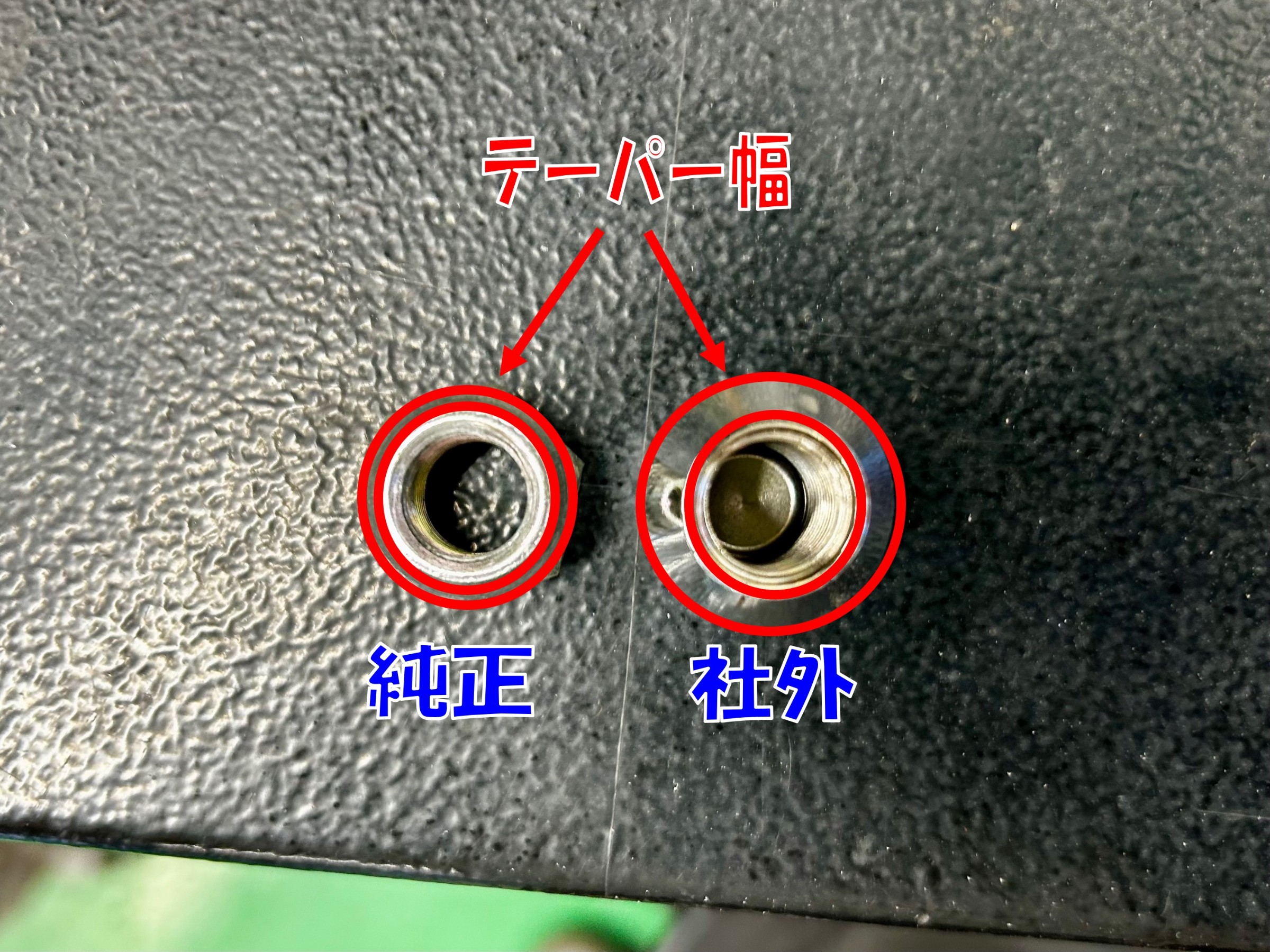 純正ナットとはテーパー部分が違うので、社外ホイールの大きいテーパー面に純正の浅いテーパーナットで異常に締め付けを行ってしまい人の力では取れない常用になっておりました!!