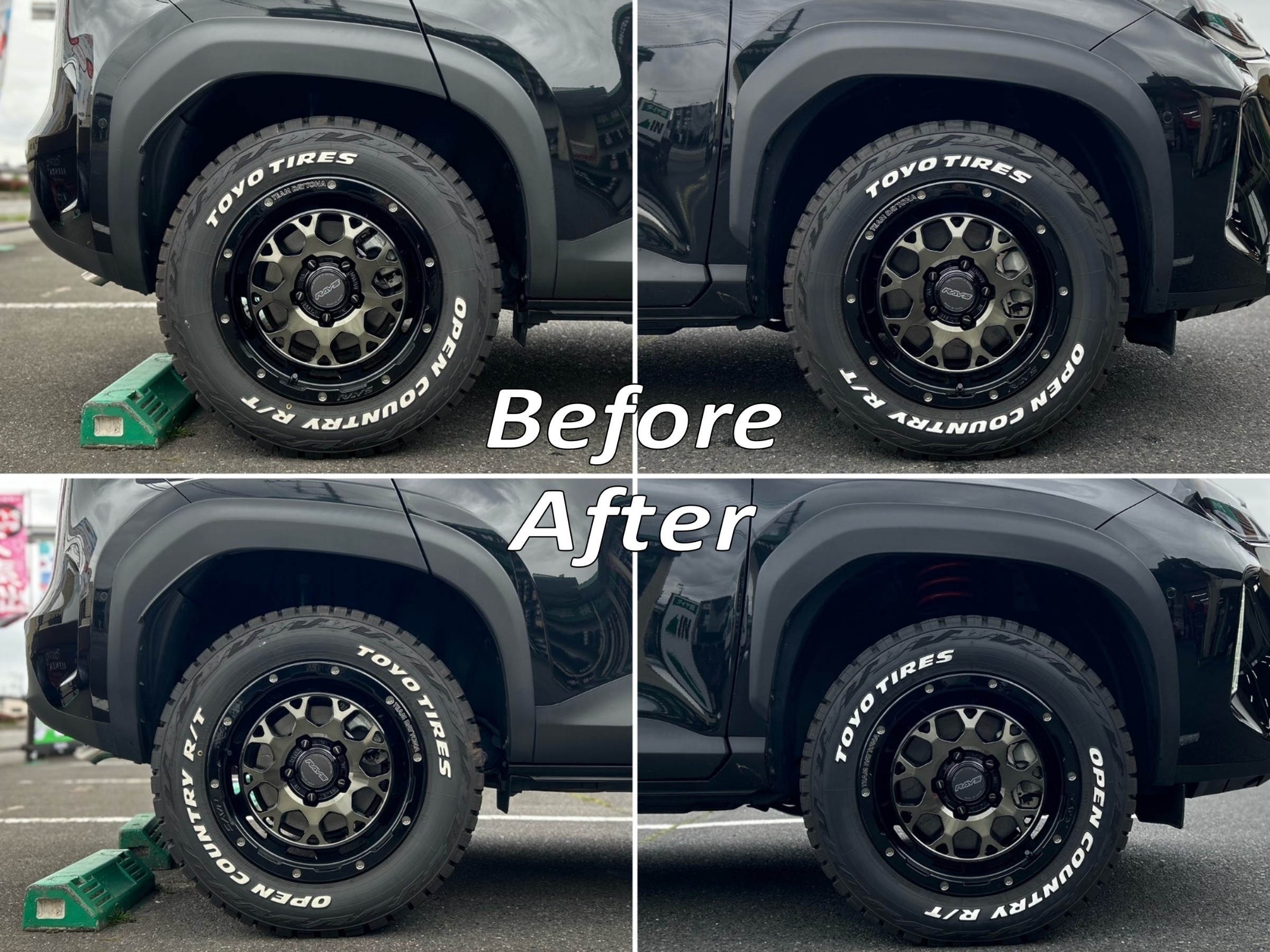 車高が少し上がるだけでゴツく見えて印象も変わったと思います♪
