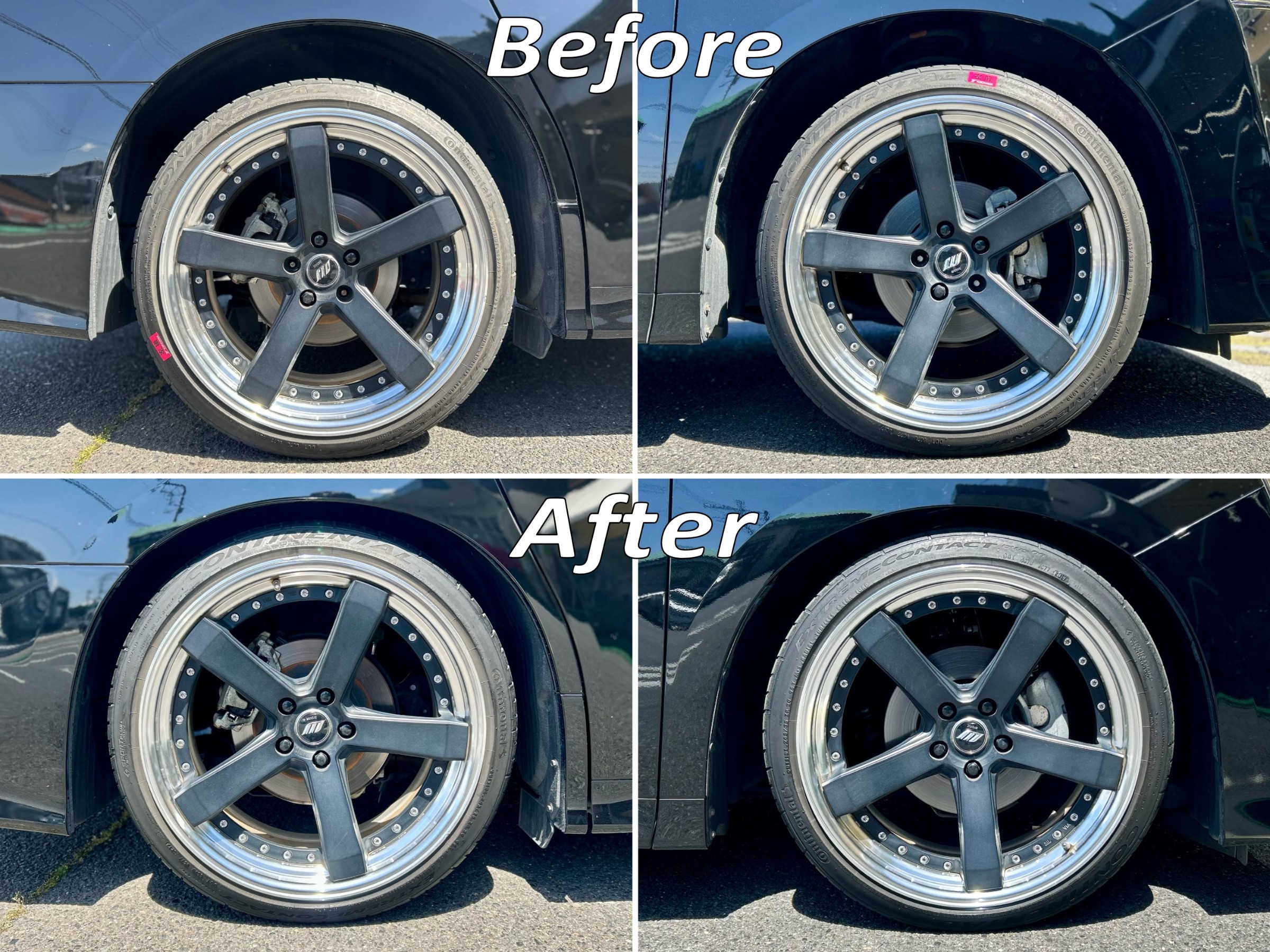 基準値でお取付けしても車高はいい感じにしっかり下がりお持ちのホイールもきれいに収まりました☆