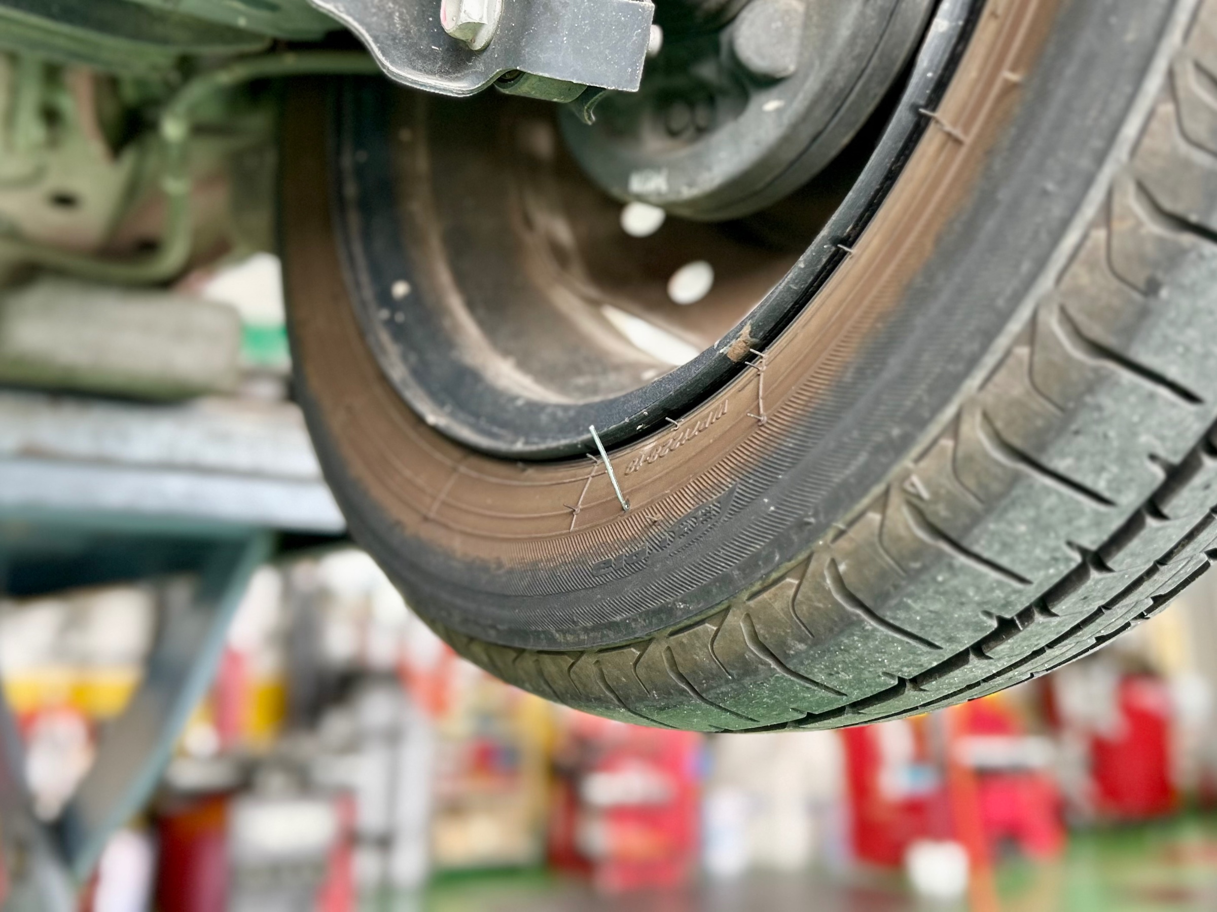早速交換作業をするのにお車をリフトで上げましたら、なんと針金みたいなのが刺さっていました!