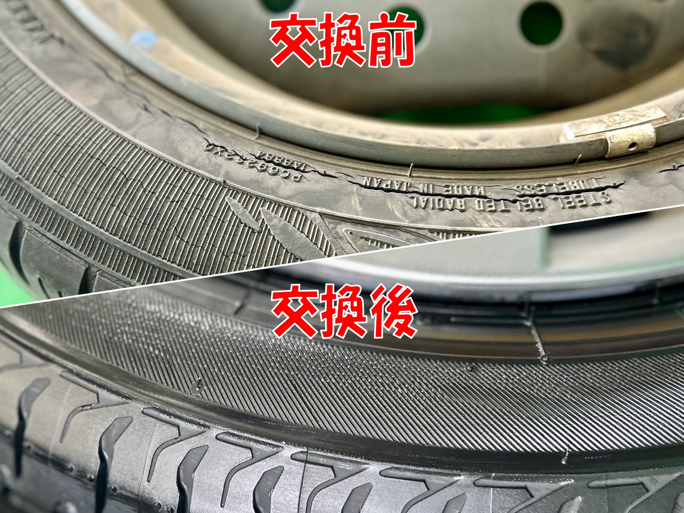 元々はタイヤの状態の点検でしたがひび割れが酷く亀裂に近い状況でしたので安心安全にお乗りになれるよう交換をオススメさせて頂きました!