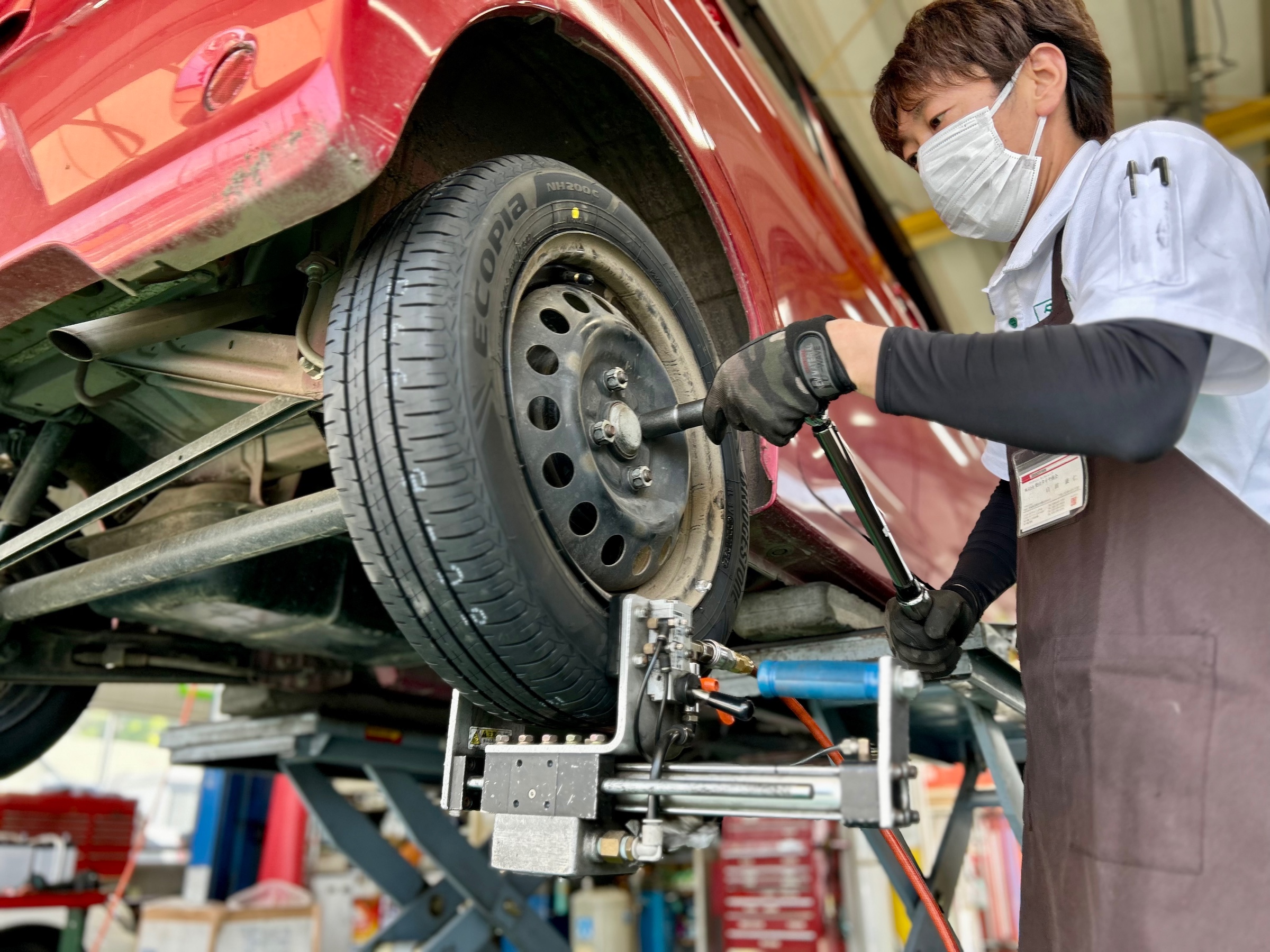 お車に取り付ける際はセンターフィットという装置を使用しホイールが取付け部の中心に来るように締め付けを行い作業しました♪