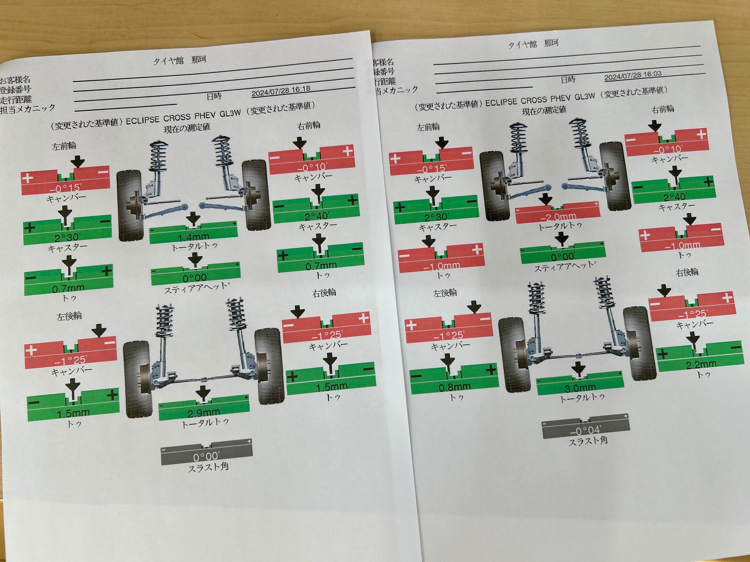 車高が下がったのでキャンバーが付いてしまいましたが調整がないのでトー4箇所基準値に合わせて完成‼