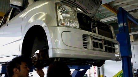 本日は車検整備中のワゴンRです。週末にお預りし本日の午後受検に向けて整備を進めてる最中です。