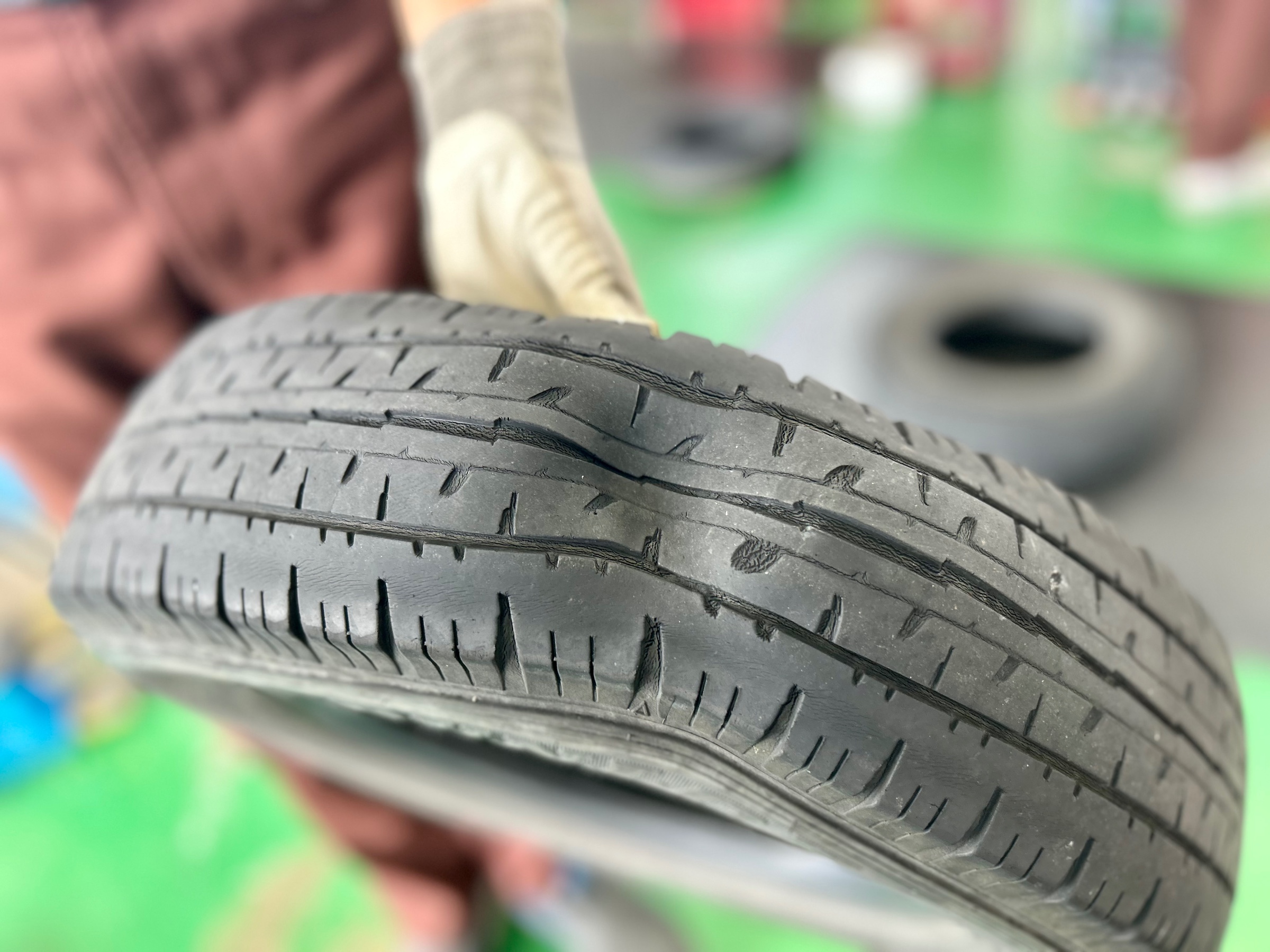 高速道路を走行中車体がやけにブレるなぁ…と思いながらも走行していたみたいで、チェックさせて頂きますとなんとタイヤが変形(セパレーション)していました!!