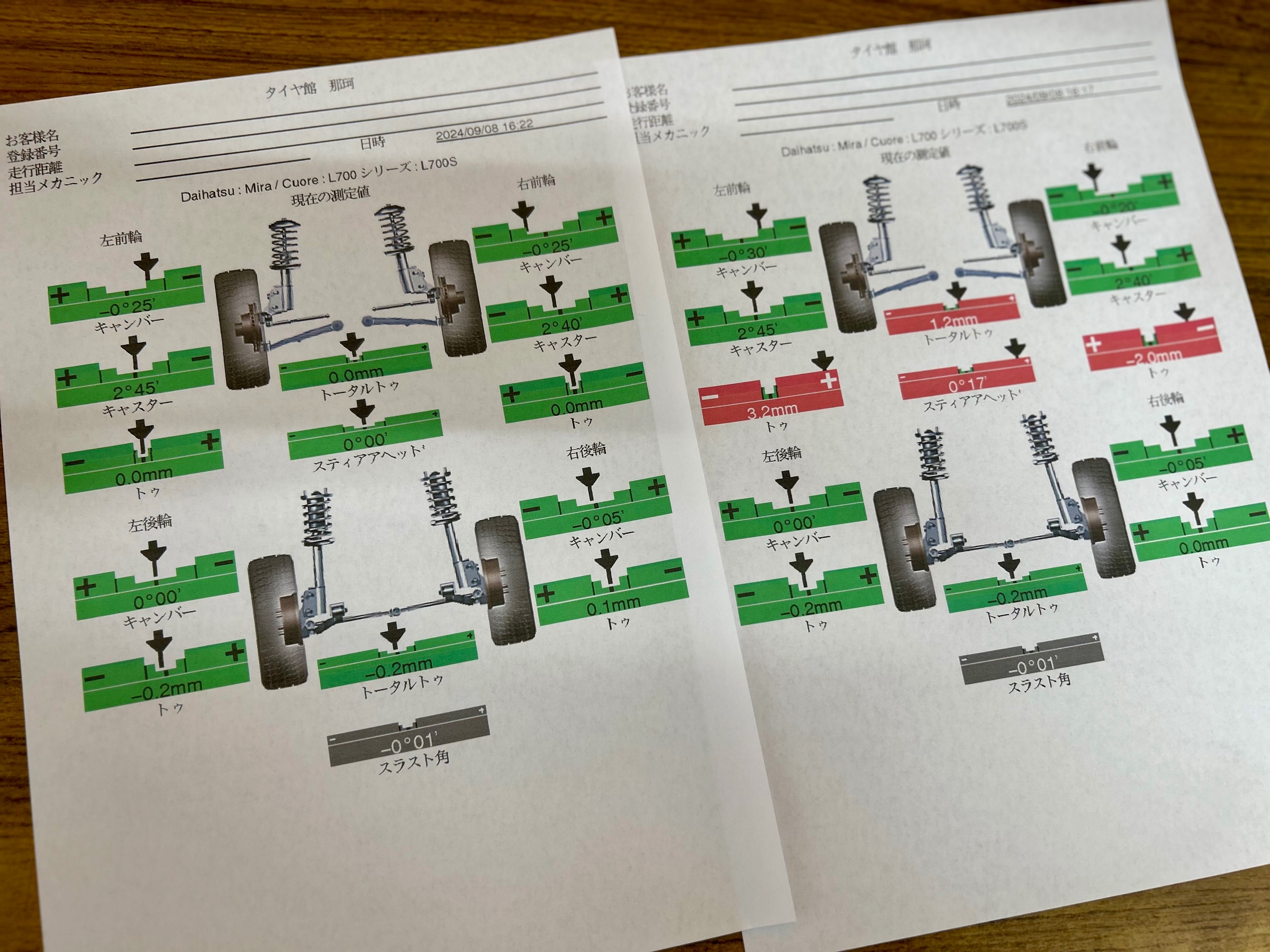 結果はフロントのトーが左右基準値外でしたのでご報告を致しまして調整作業に入らせて頂きました☆