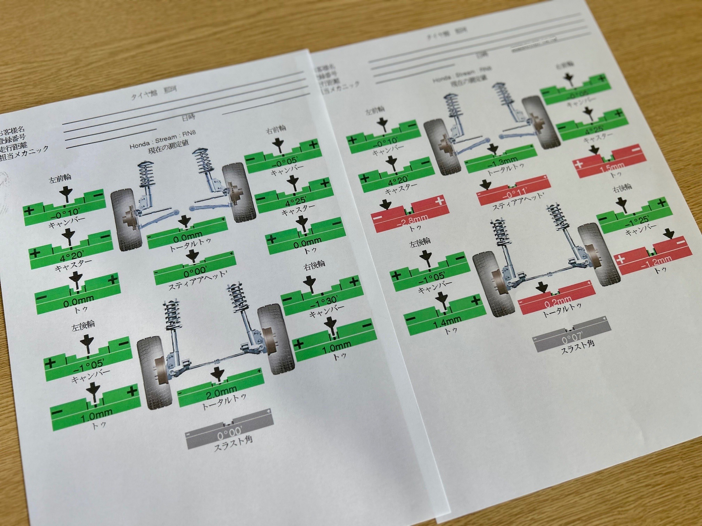 測定してみますと左リア以外のトーが基準値からズレていて、フロントはトータルトーがマイナス表示なので内減り傾向になっていました。。。