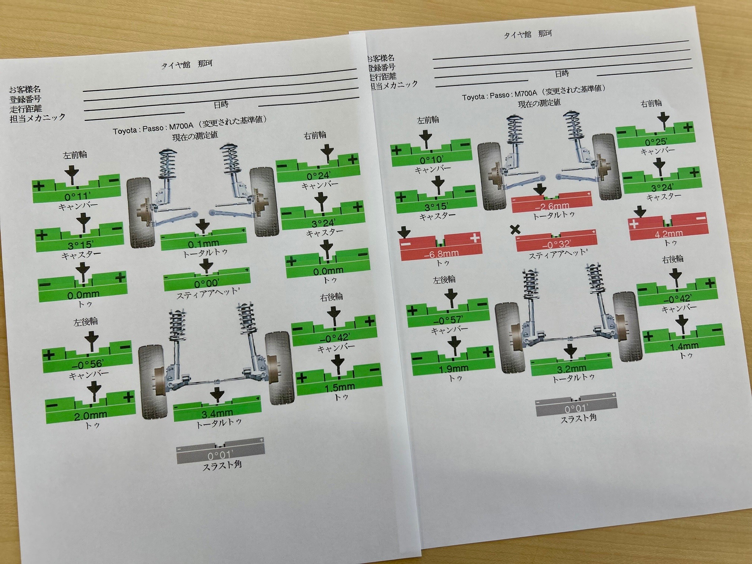 パッソの調整個所はフロントのトーのみしか調整できませんので基準値ど真ん中にしっかり合わせて作業完了です♪