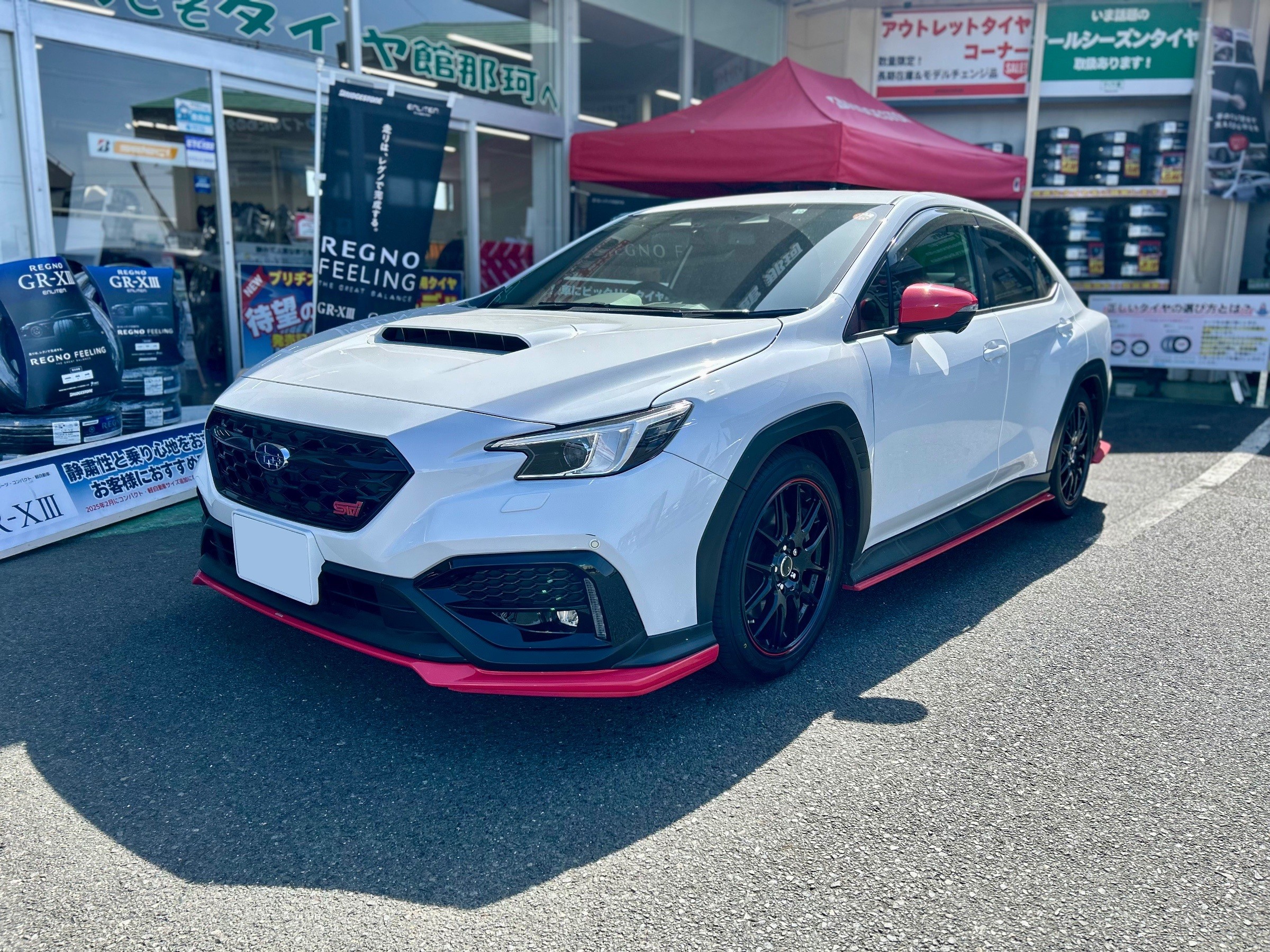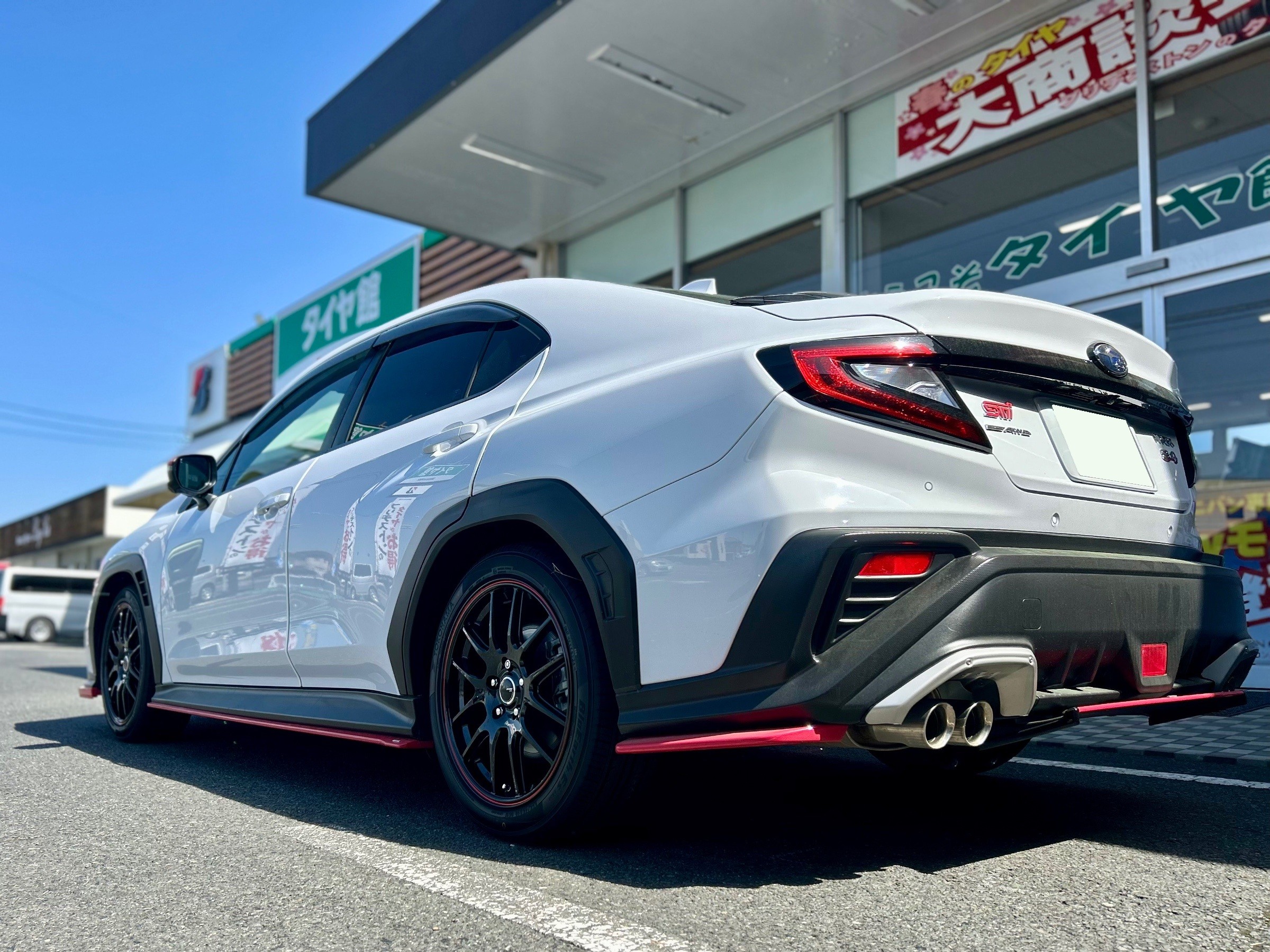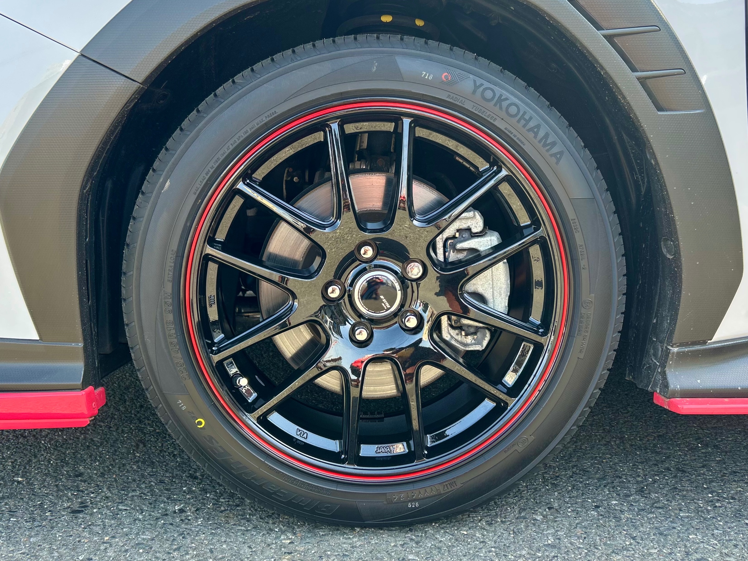 純正ホイールのシルバーカラーからブラックになりお車の雰囲気が変わり、そこにエアロと同じ赤のワンポイントが加わりバランスがバッチリに‼