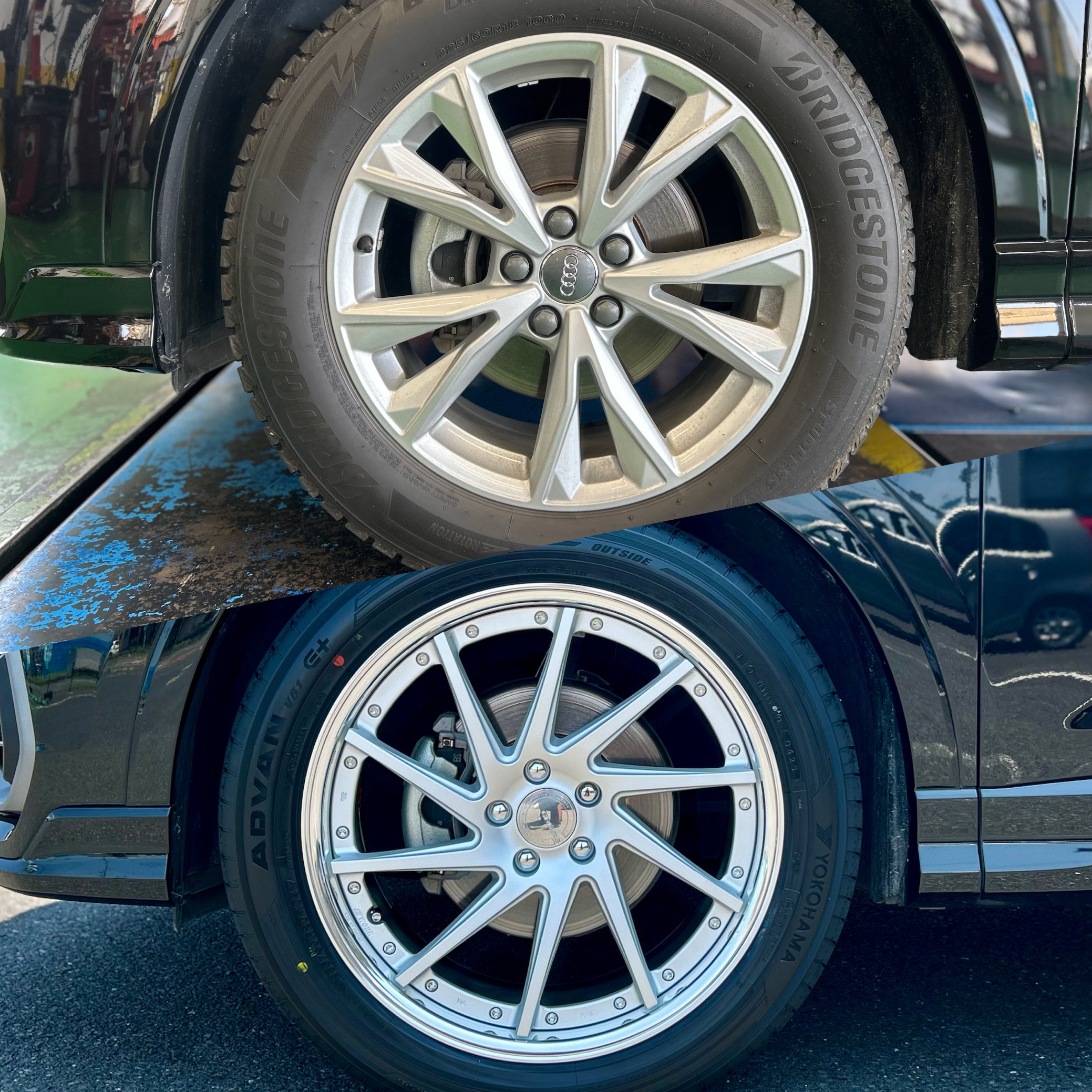 純正ホイールと比べてみますとかなりスッキリ感が出て捻り・コンケイブ・カラーとオシャレな外車に変わっったと思います☆