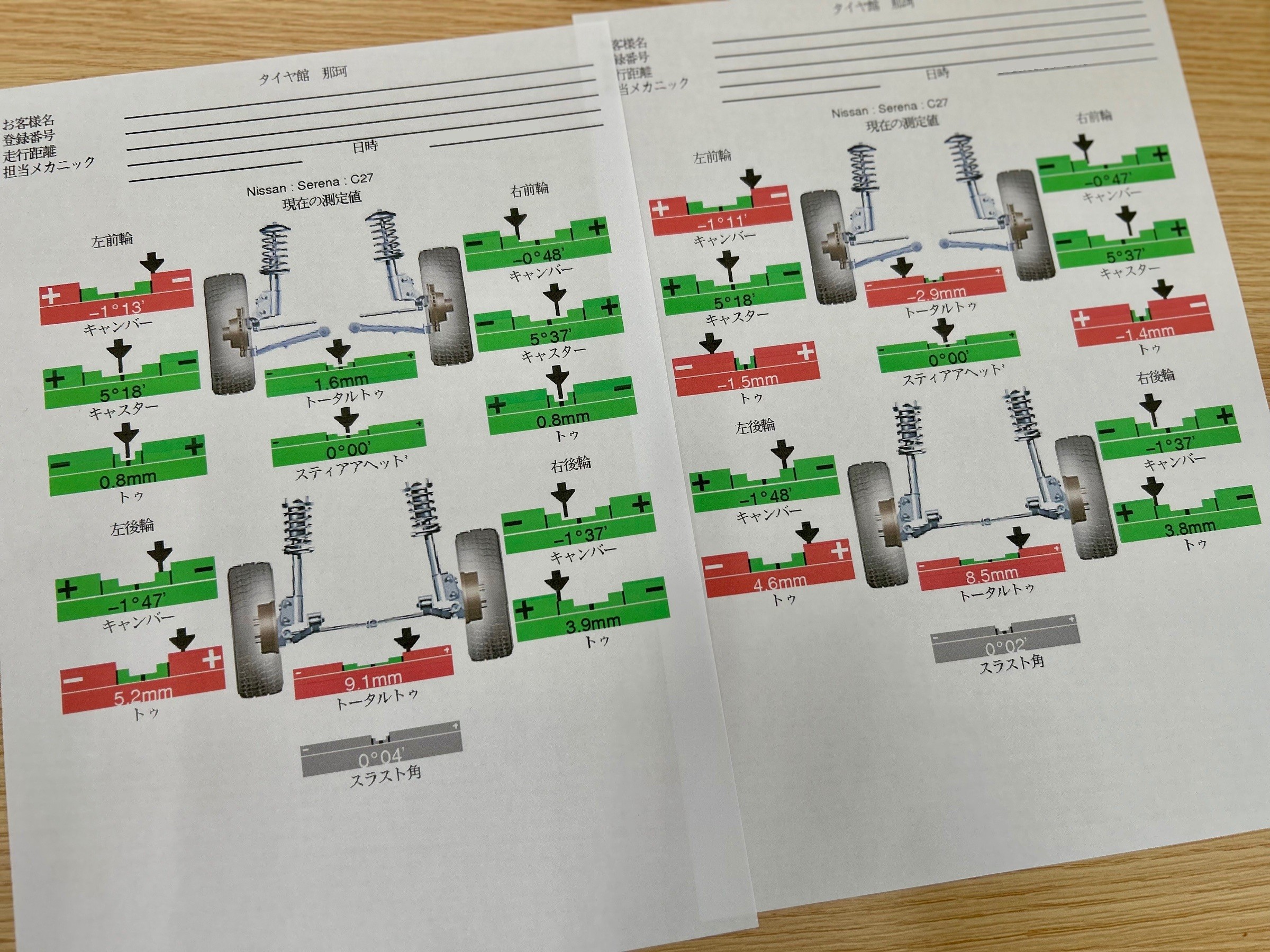 このままですとタイヤの内減りが酷くなってしまいますので基準値ど真ん中にしっかり調整しました!