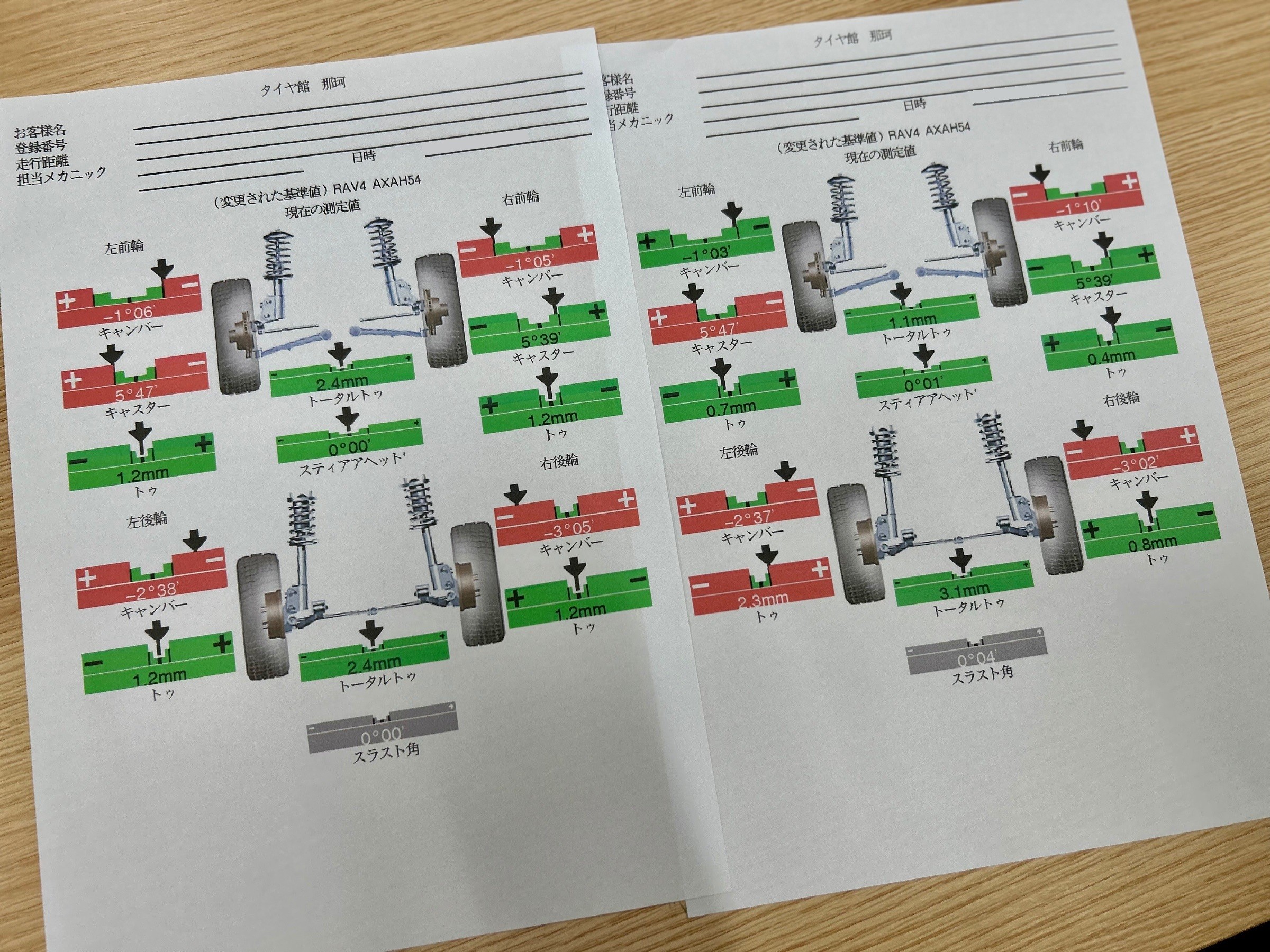 調整個所は前後のトー4箇所調整になりますので基準値からズレているトーをど真ん中に修正♪