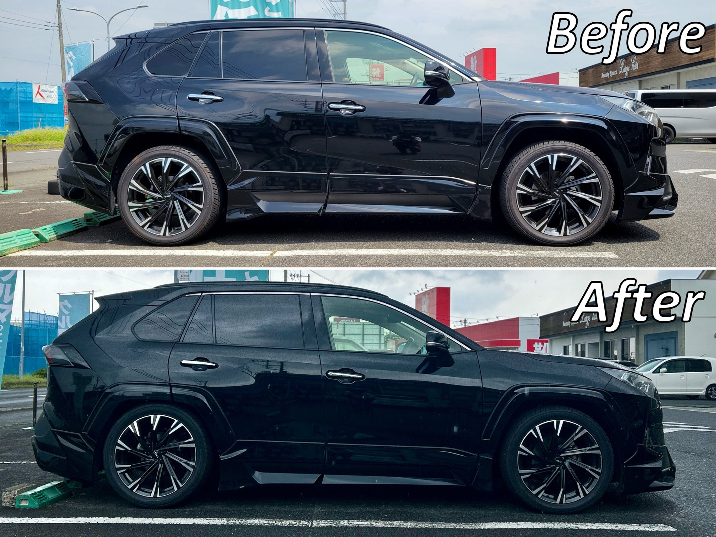 RAV4はSUVタイプのお車になりますので元々が車高高めのお車ですが、下げるとどっしり感がでてかっこよく仕上がりました☆