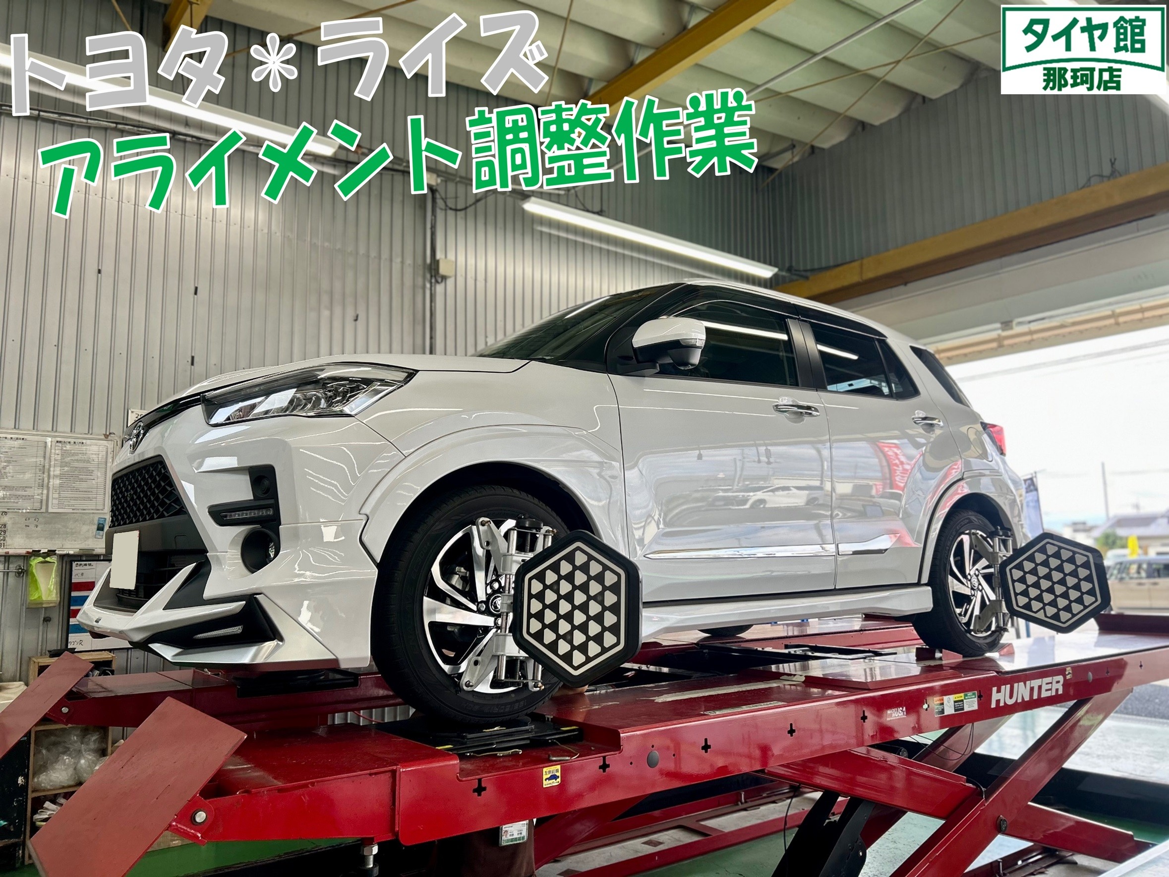 ライズはフロントトーのみの調整になりますので作業時間が少ないお車となります♪