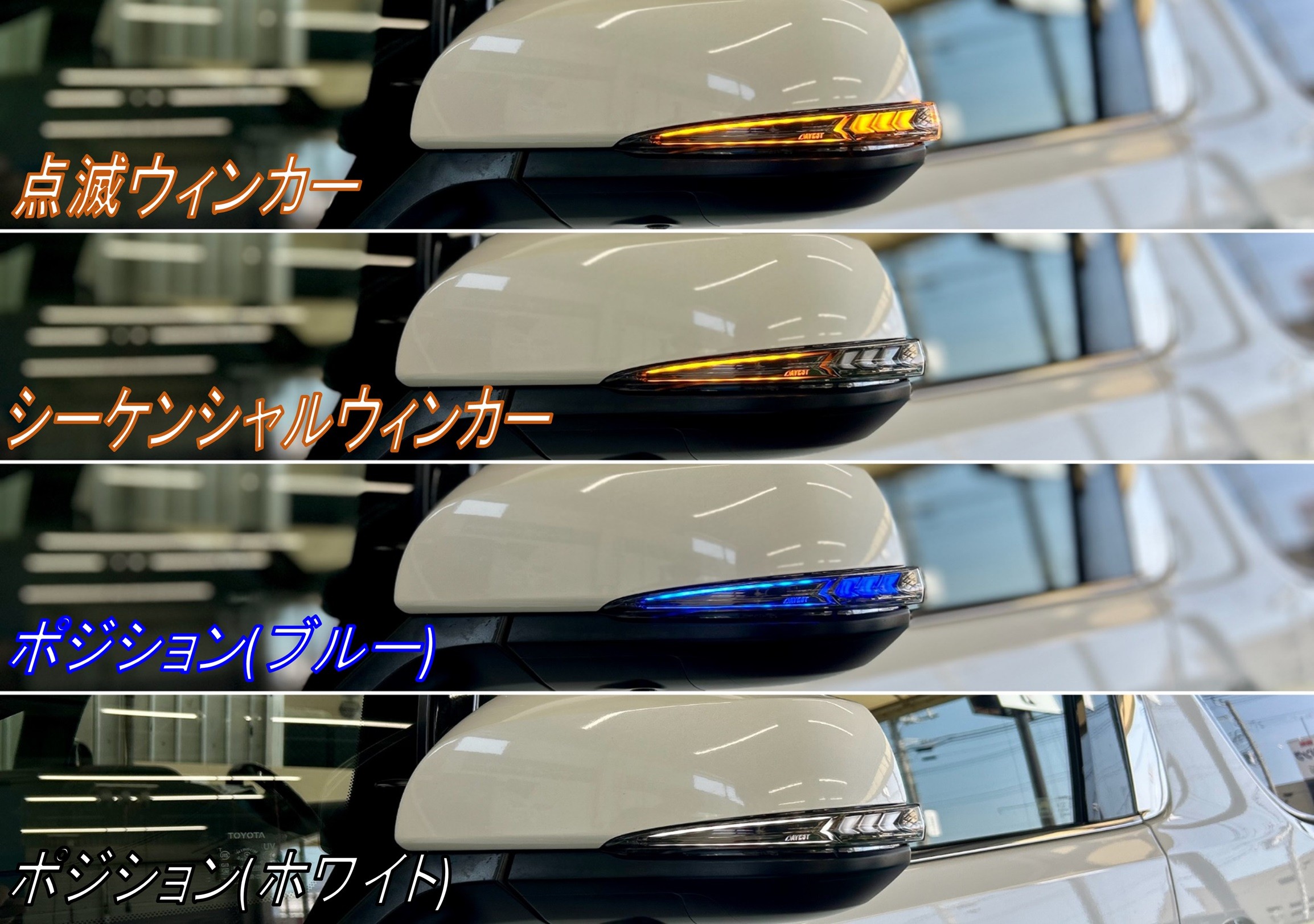 ウィンカーはスイッチで点滅・シーケンシャルの切り替えができ、ポジションはブルーかホワイトの選択が[VerticalArrow Type α]からコチラもスイッチ切り替えで選択が出来るようになりました♪