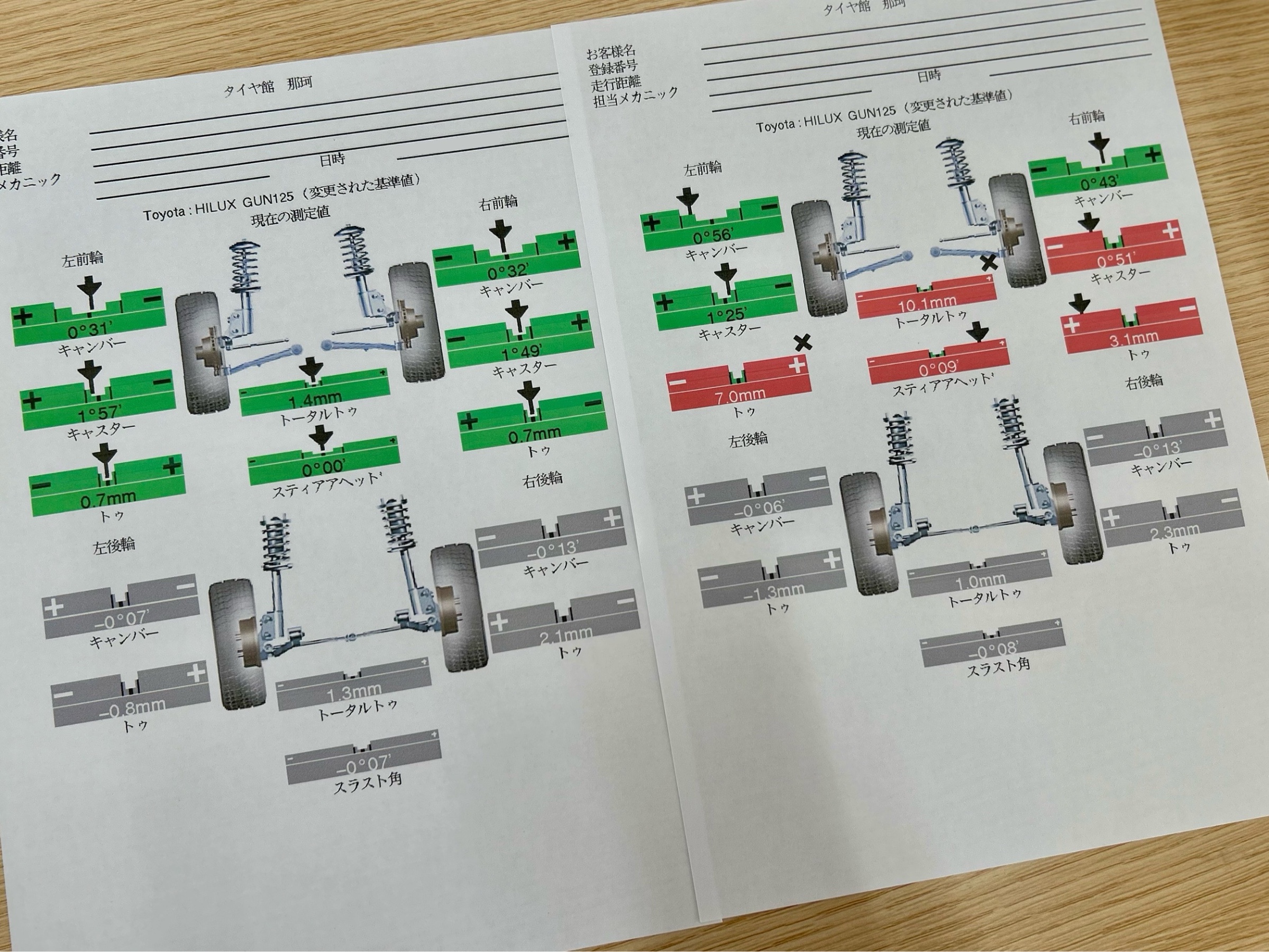 キャンバーとキャスターはどちらかを調整すればもう片方も動いてしまいなかなか合わせるのが大変でお時間がかかる作業になります!