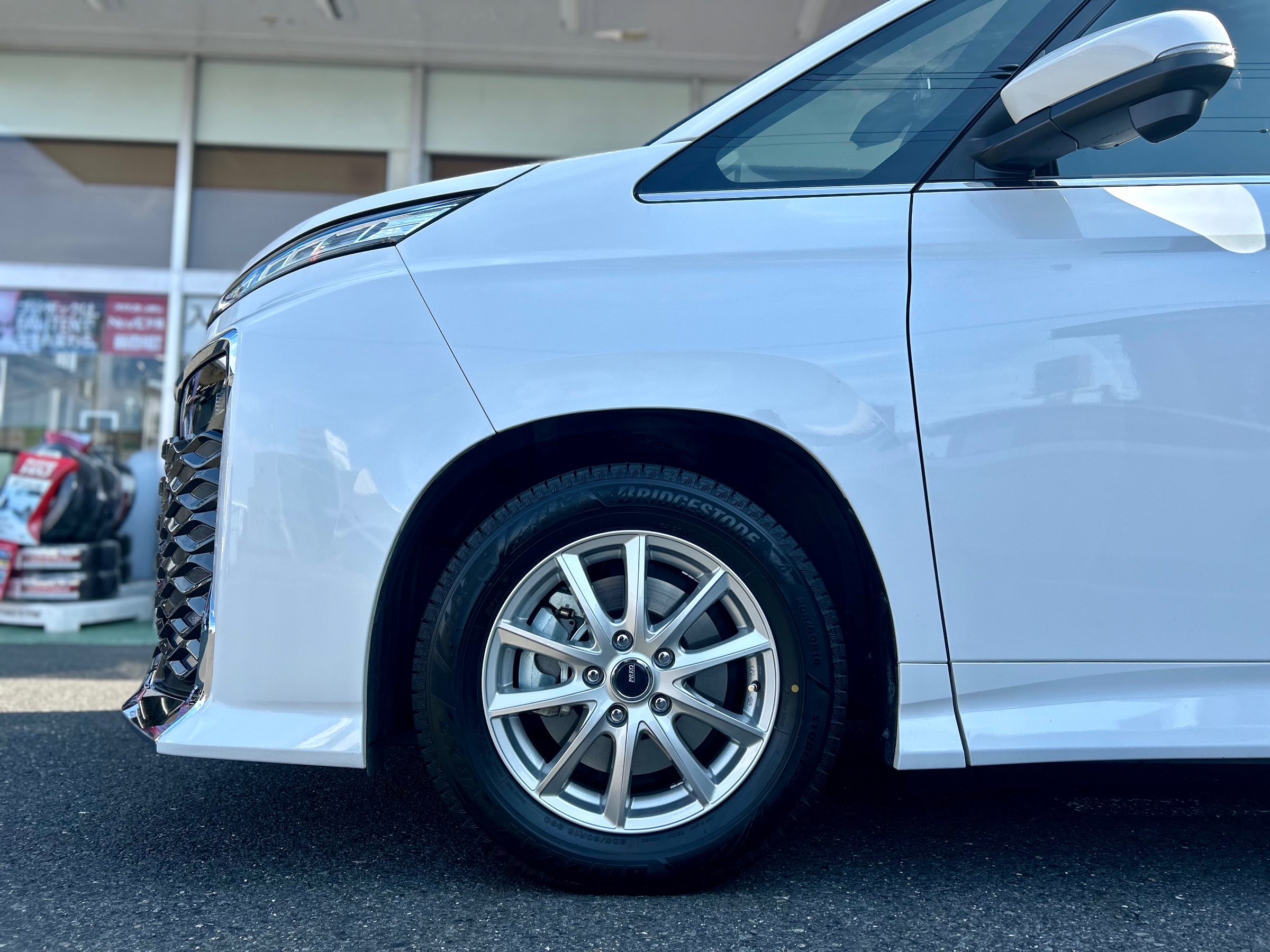 ホイールはブリヂストンで限定販売しておりますプレオL5になりましてシンプルにスッキリしたデザインですので洗車後の吹上げも楽に行えます☆