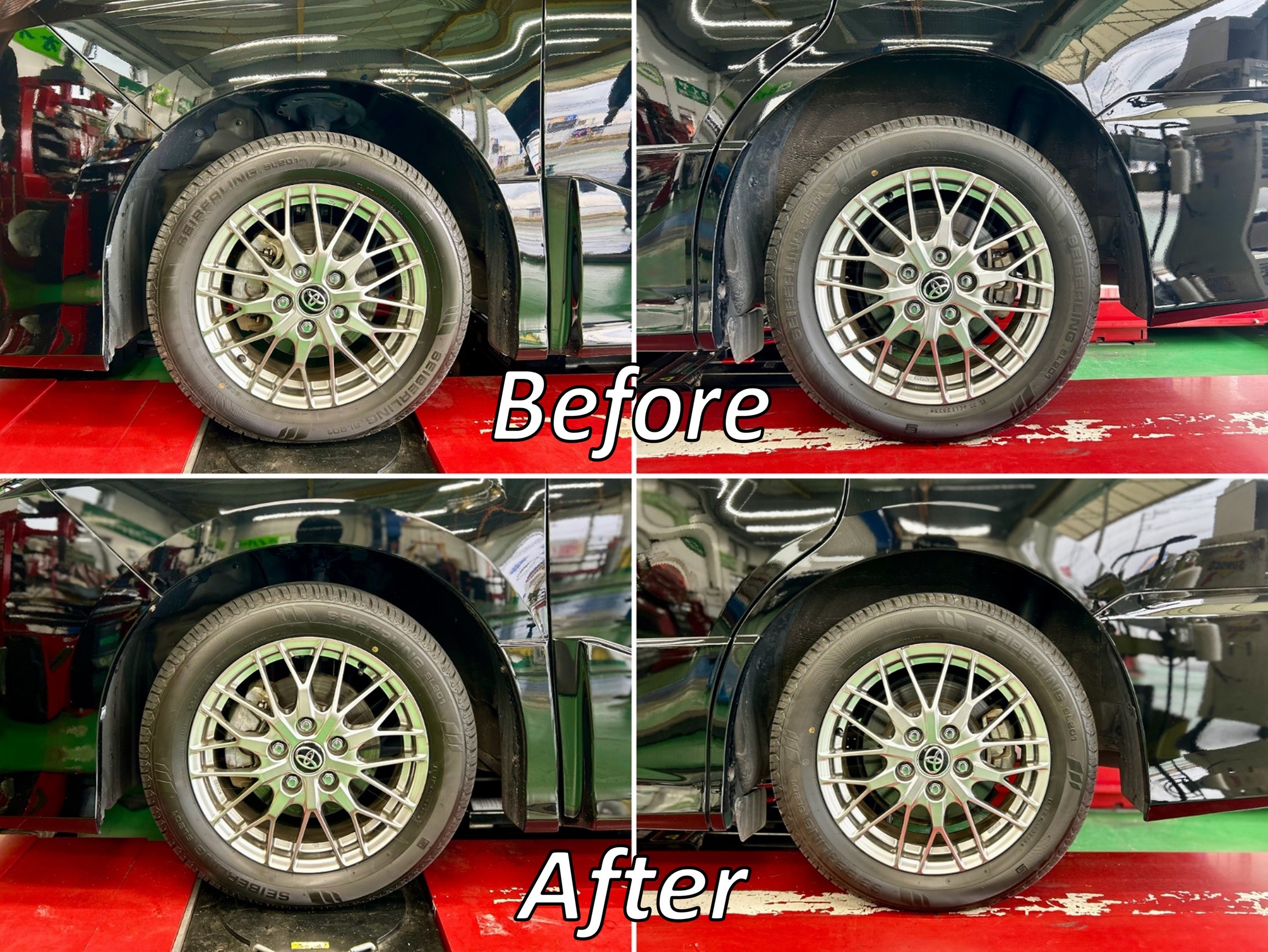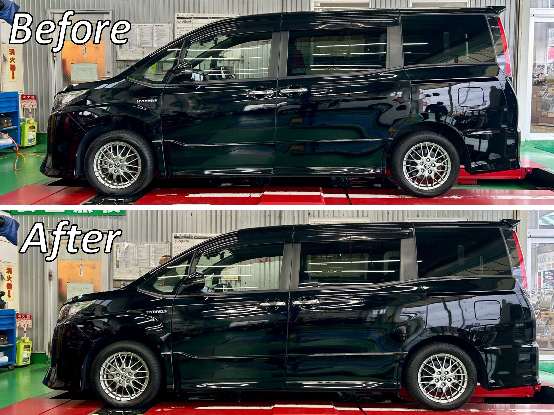 全体像で見比べますと車高が下がったといえどもいかにも下げました感がなく最初からこの車高だったのでは?と思うぐらいさりげない仕上がりに♪
