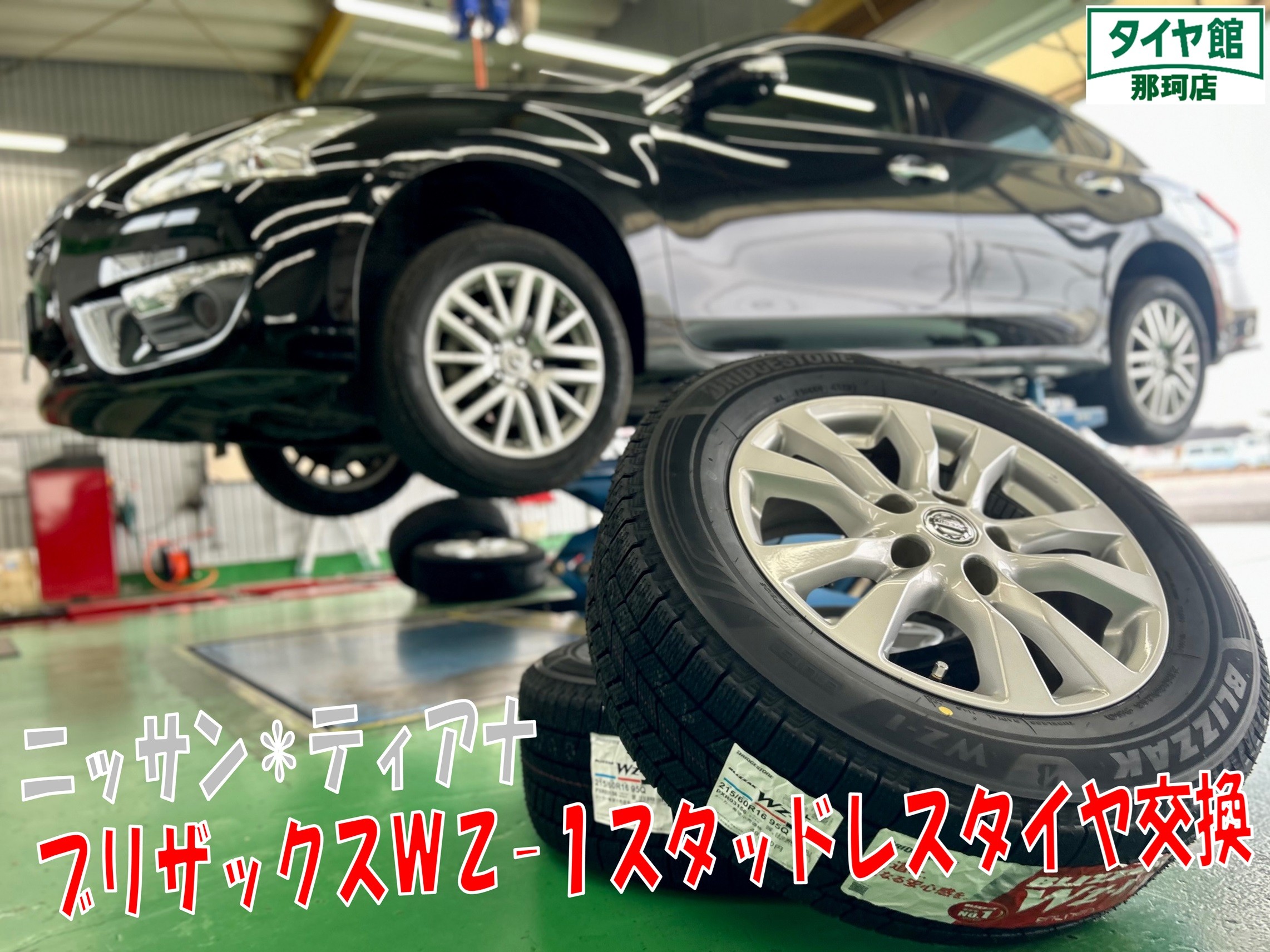 本日ご紹介させて頂く作業は、ご予約頂いておりましたティアナのスタッドレスタイヤ取付作業になります♪