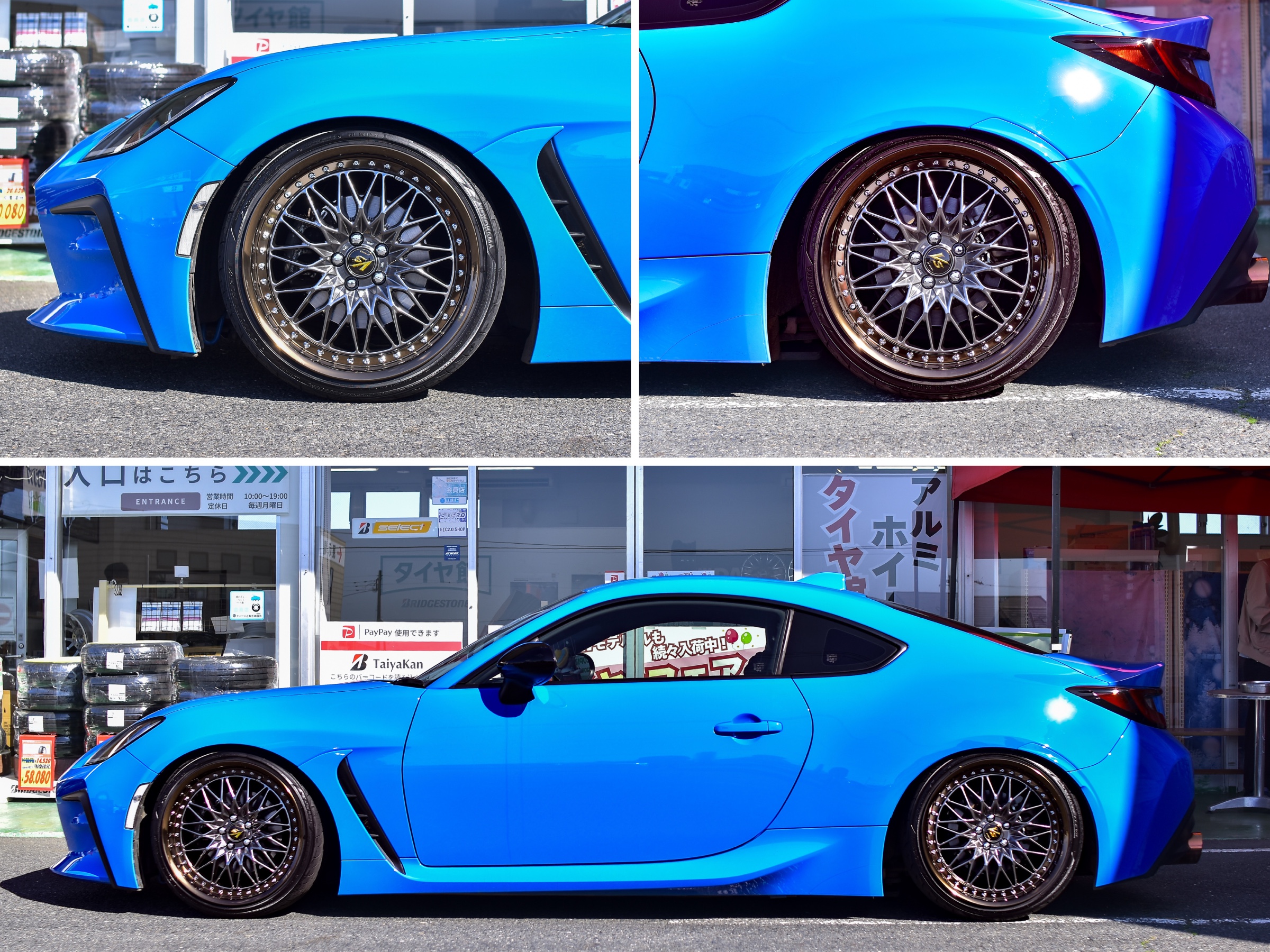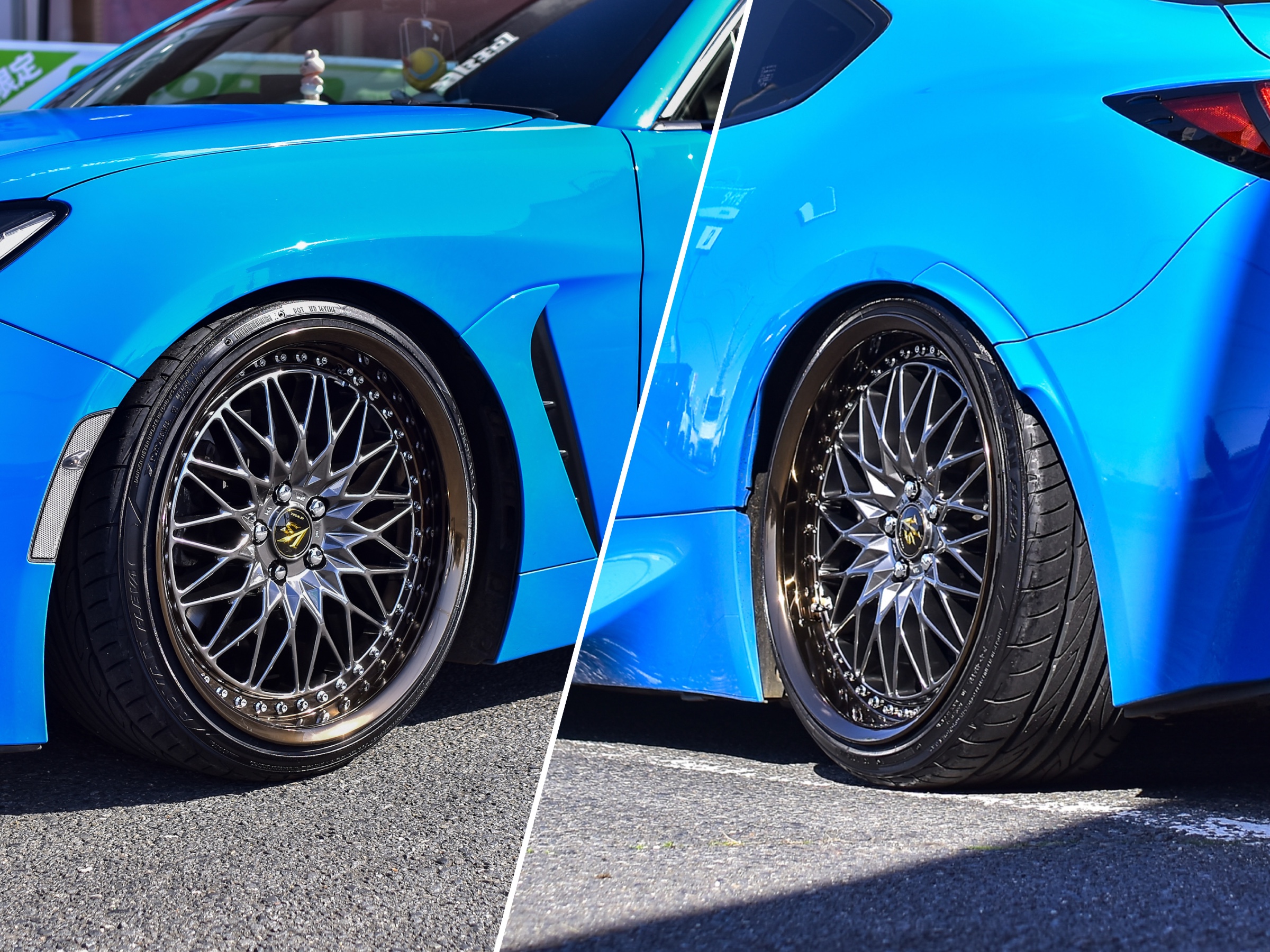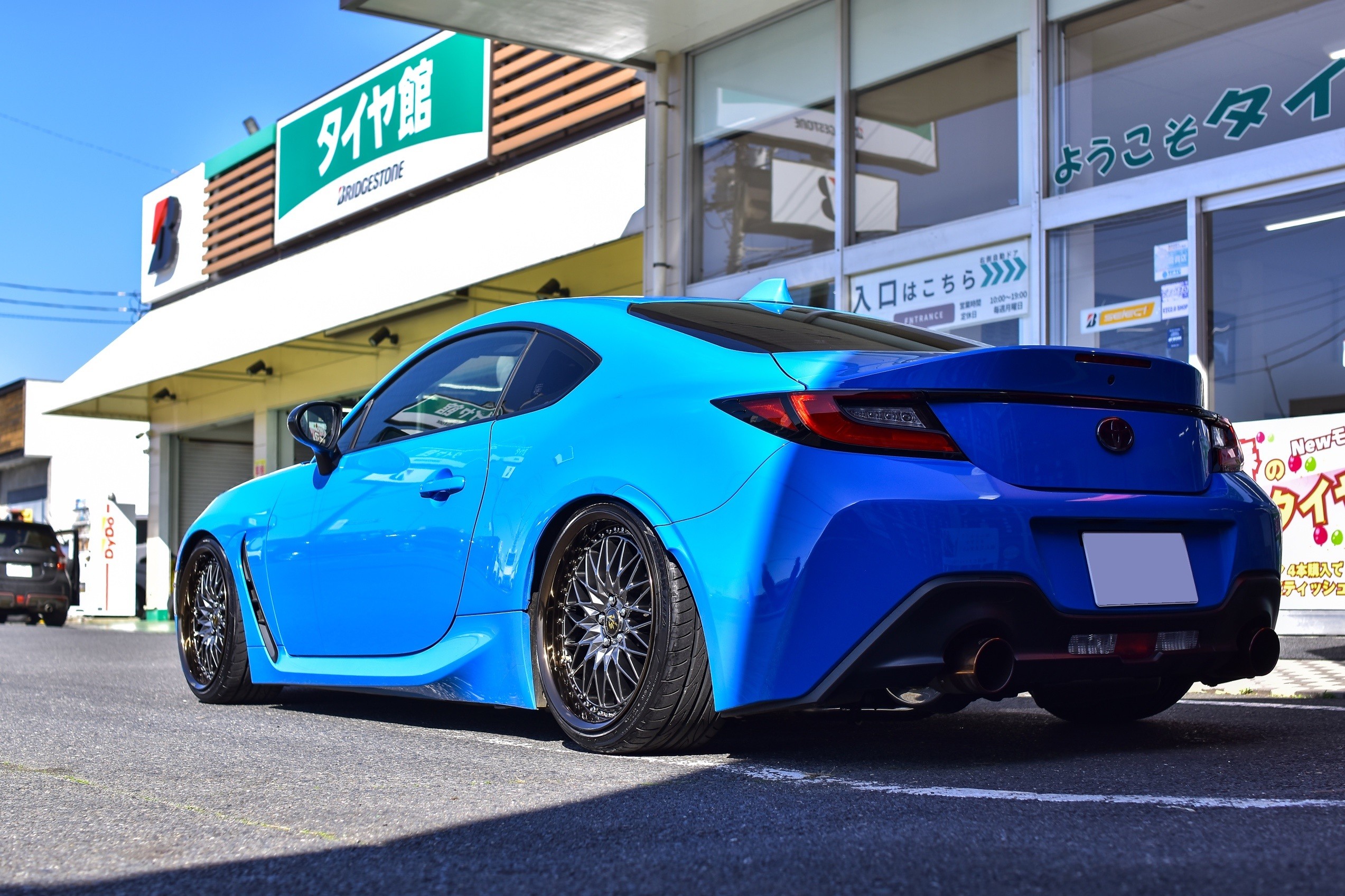 前後で同じカラーですが光加減でホイールの色味が変わるので、駐車場所によってお車の印象を変えてくれるかと思います♪
