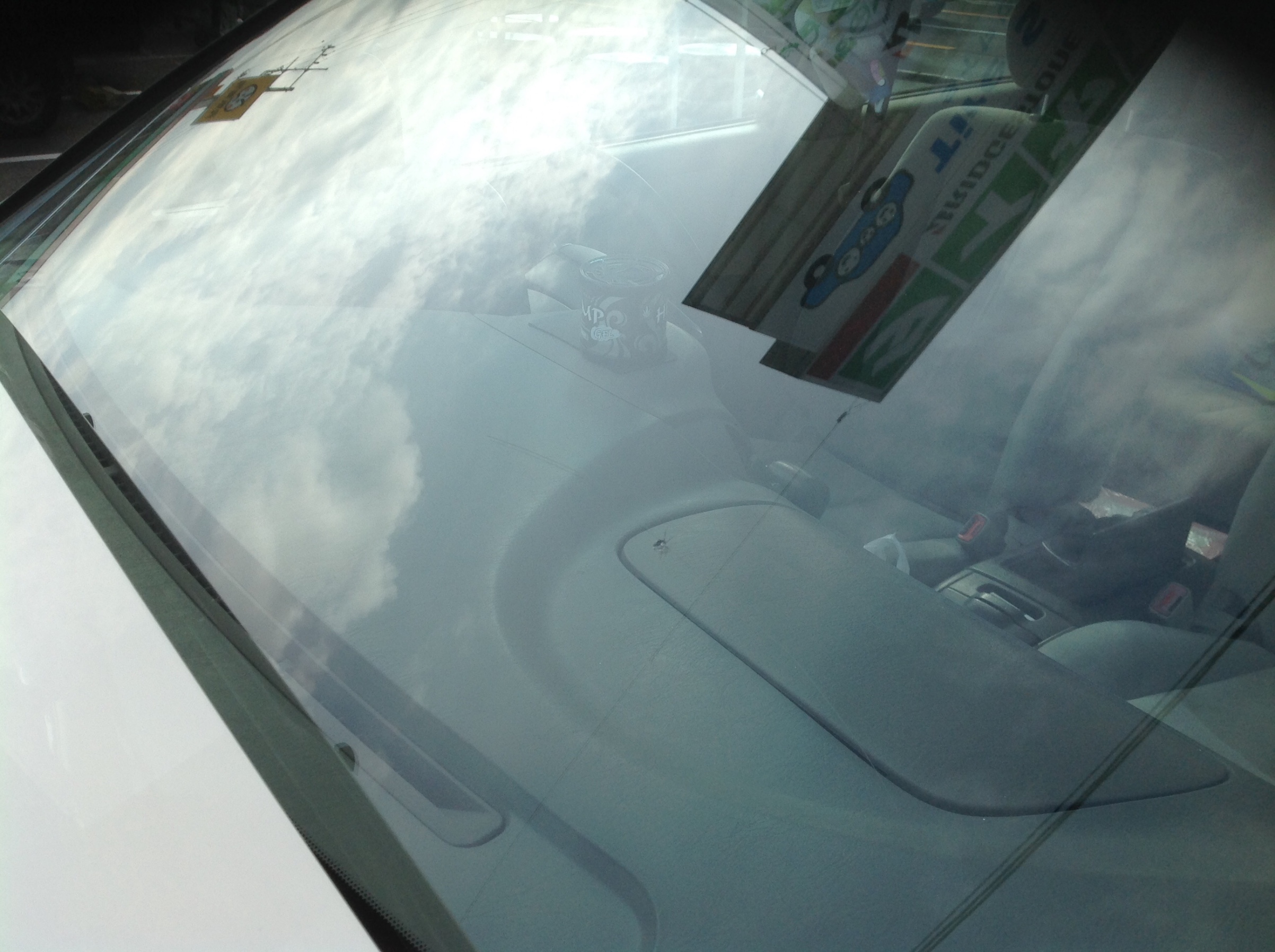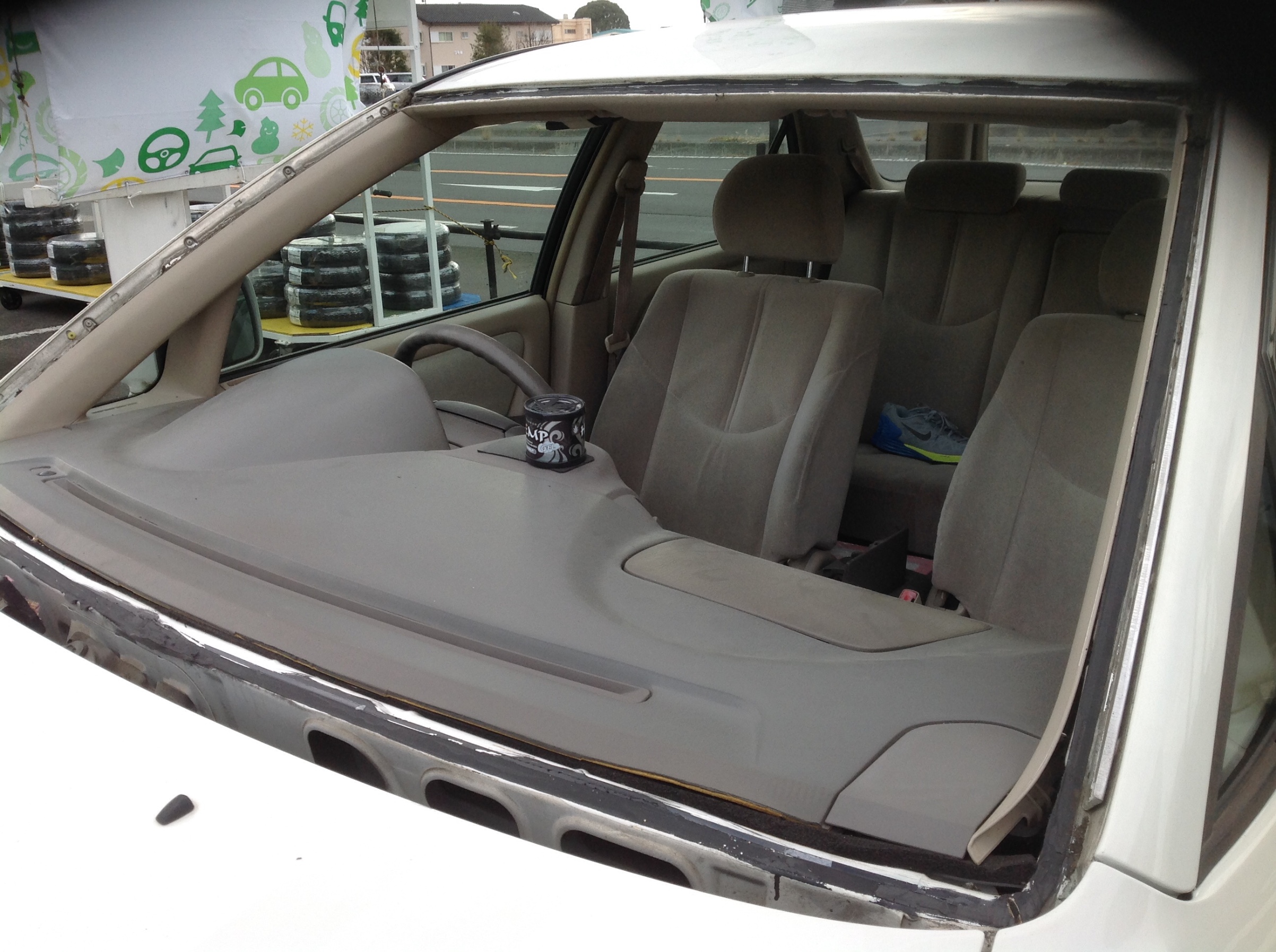 フロントガラスにヒビがΣ(゚д゚lll)コレでは車検に通りません。。。ヒビが入ってしまったガラスを取り外して…