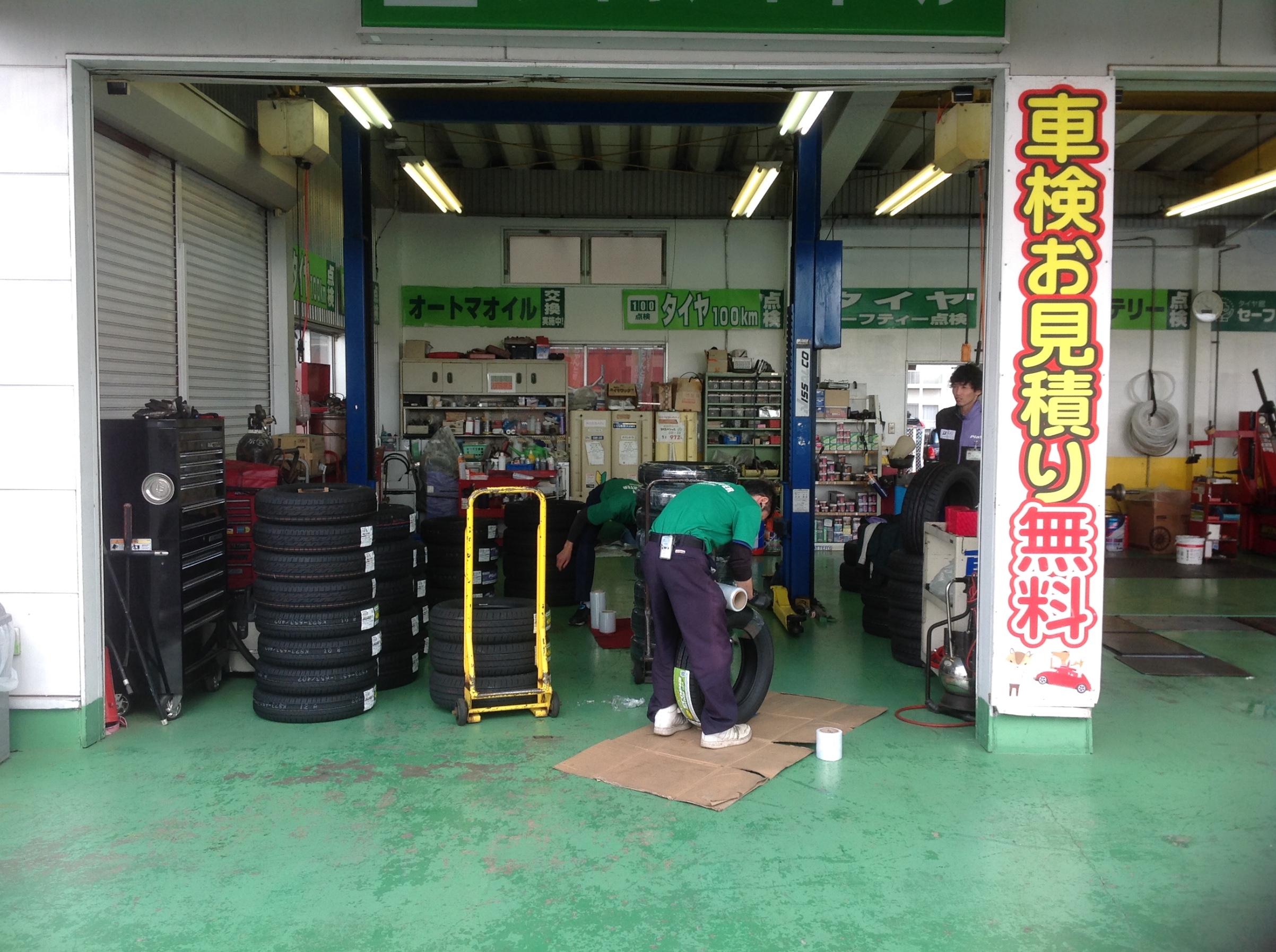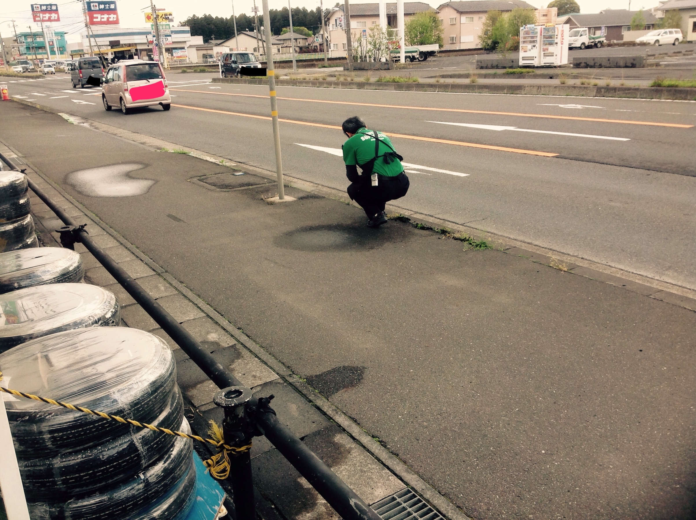 作業するお車もひと段落したので皆んなでオープン展示に飾るタイヤのヤップ巻きをしています。。。↓あっ(><)間違えてしまいました。。。sk店長の草むしりの写真を載せてしまいました。道路側まで、草むしりお疲れ様です(〃ω〃)腰やらない様に気を付け下さい。。。←(じゃあ、那珂ん太がやれよ(`_´)ゞ)そーでしたね。sk店長すみません。。。。今度こそ↓