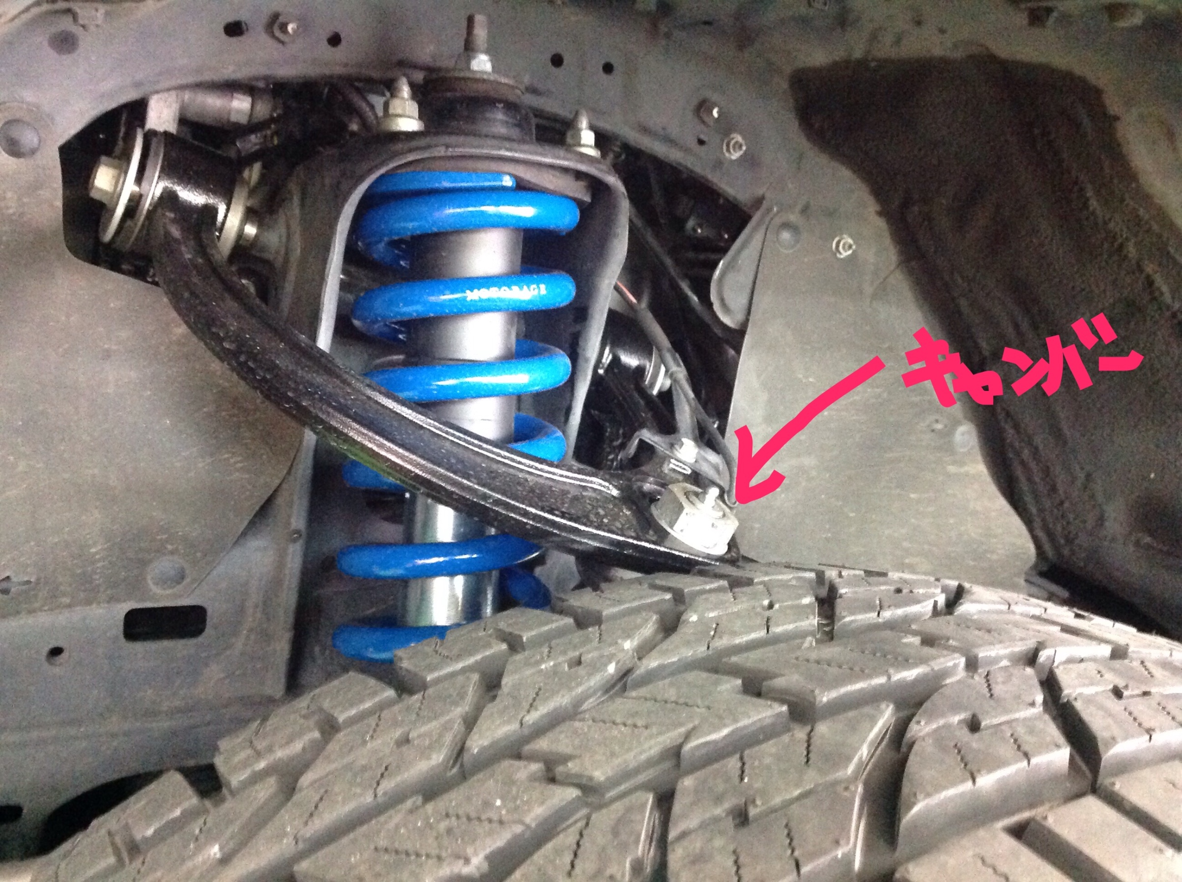 キャンバーをおこした状態になりますね。リフトアップしてあるのでやり易いですね。トゥも調整して終了になります!